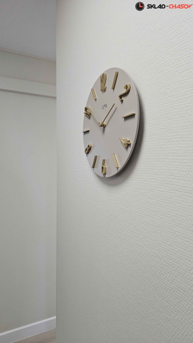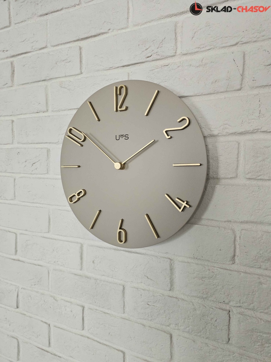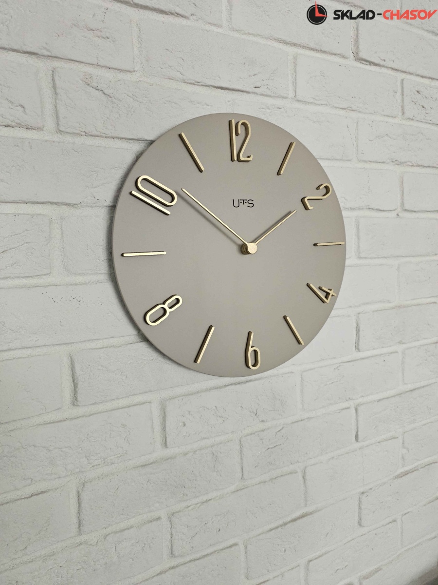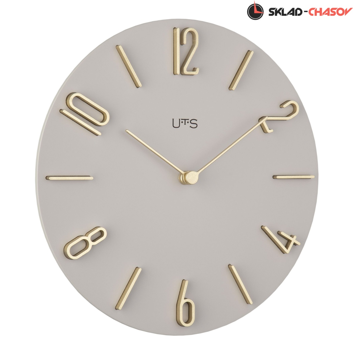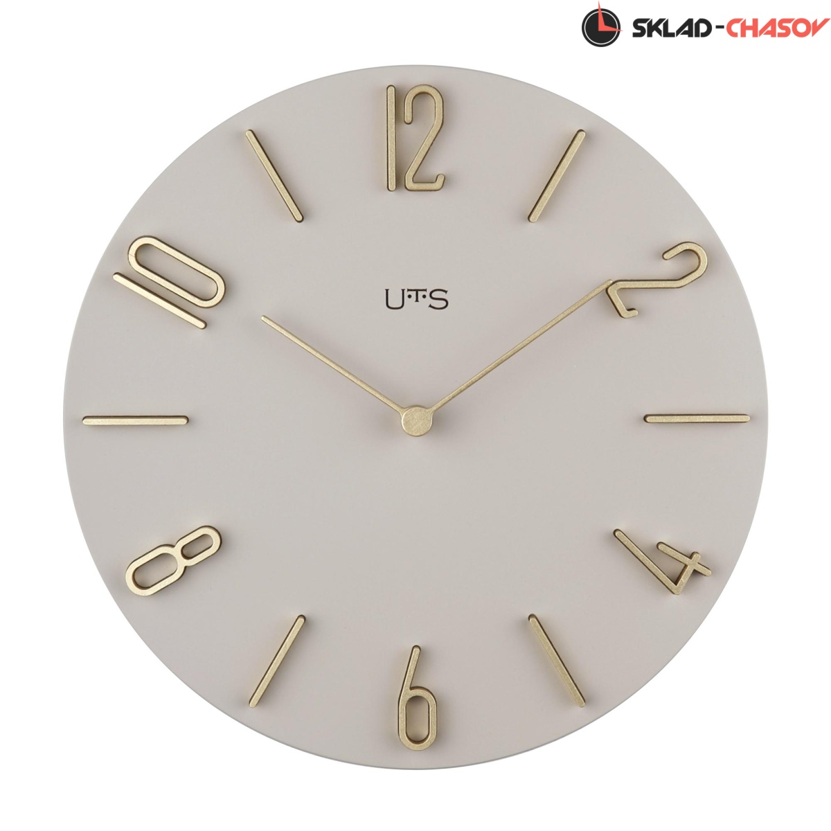Кварцевые настенные часы с современном стиле. Корпус из МДФ с эмалью в серо-бежевом оттенке. Объемные арабские цифры выполнены в золотом цвете и аккуратно утоплены в специальных ложементах. В часах установлен бесшумный, точный и надежный механизм Young Town 12888 c плавным ходом. Необходим 1 элемент питания типа АА (в комплект не входит).
