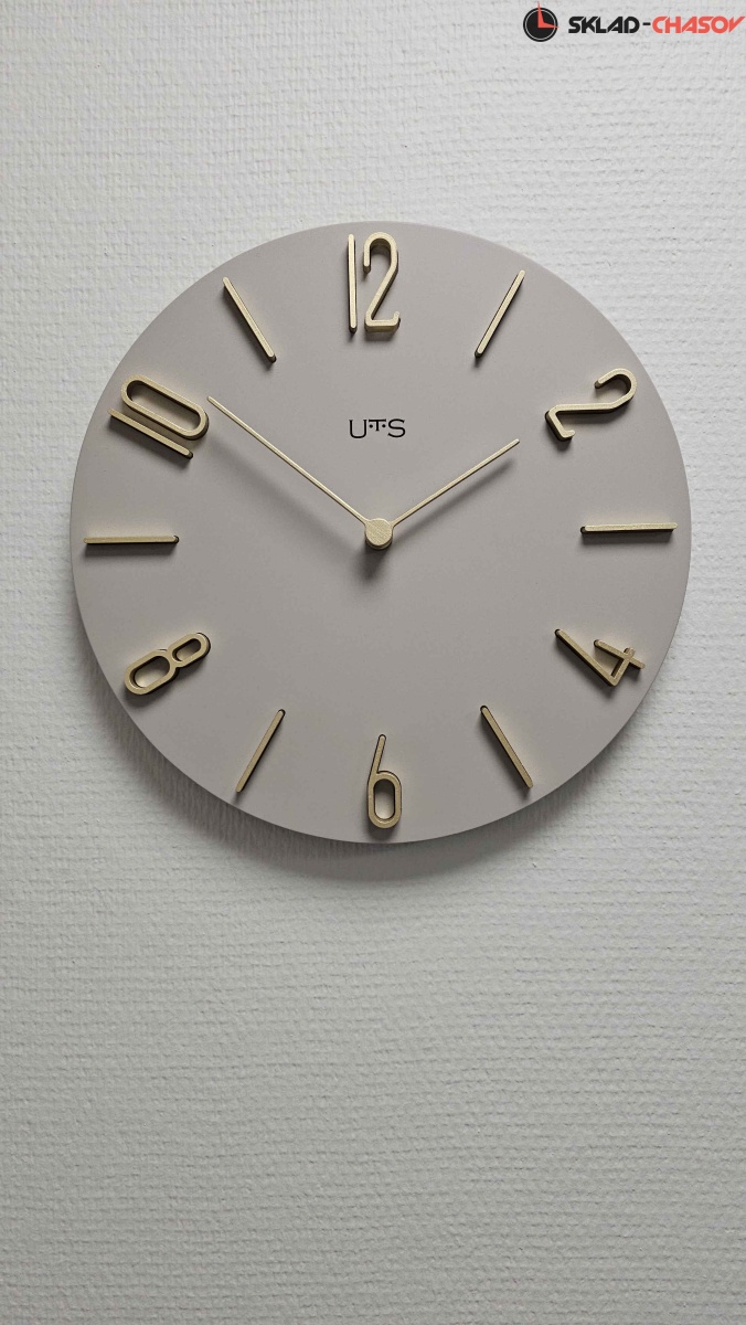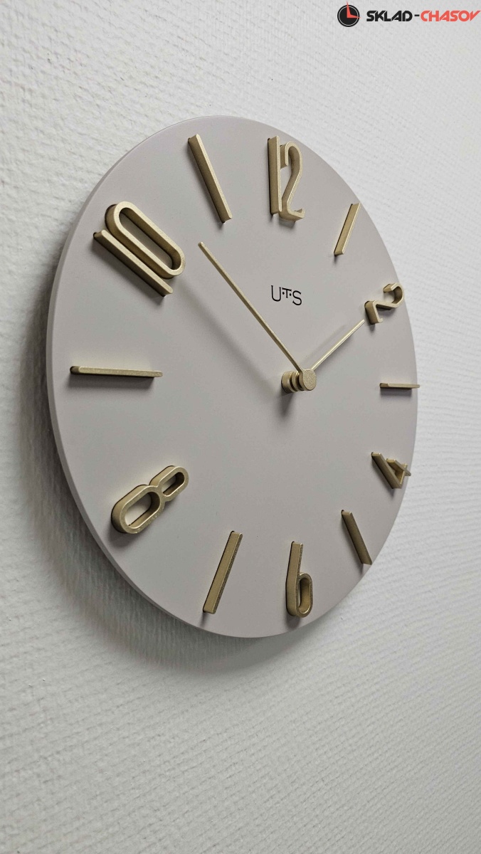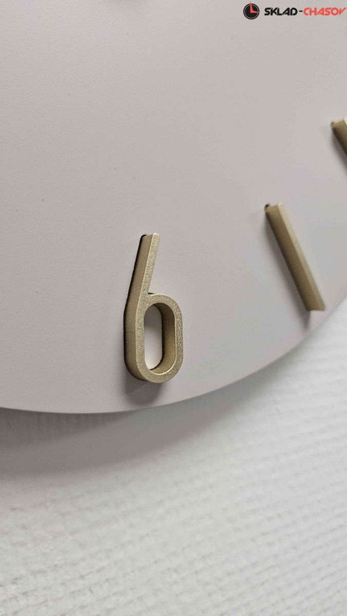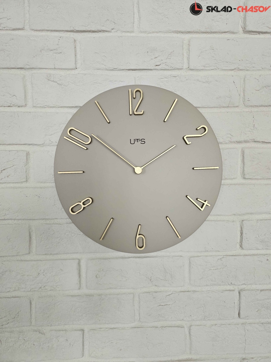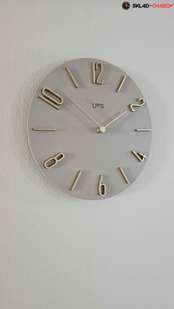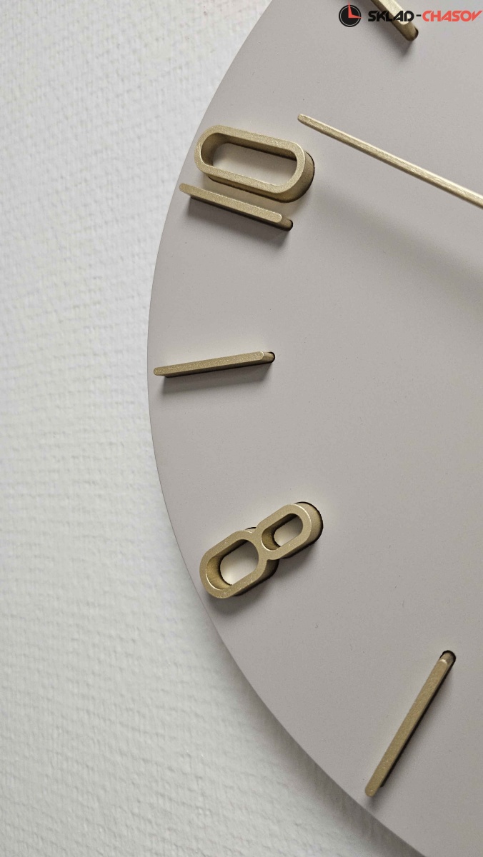 Кварцевые настенные часы с современном стиле. Корпус из МДФ с эмалью в серо-бежевом оттенке. Объемные арабские цифры выполнены в золотом цвете и аккуратно утоплены в специальных ложементах. В часах установлен бесшумный, точный и надежный механизм Young Town 12888 c плавным ходом. Необходим 1 элемент питания типа АА (в комплект не входит).