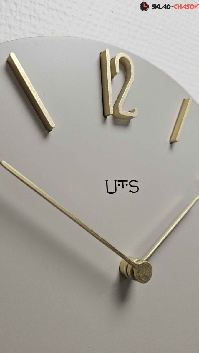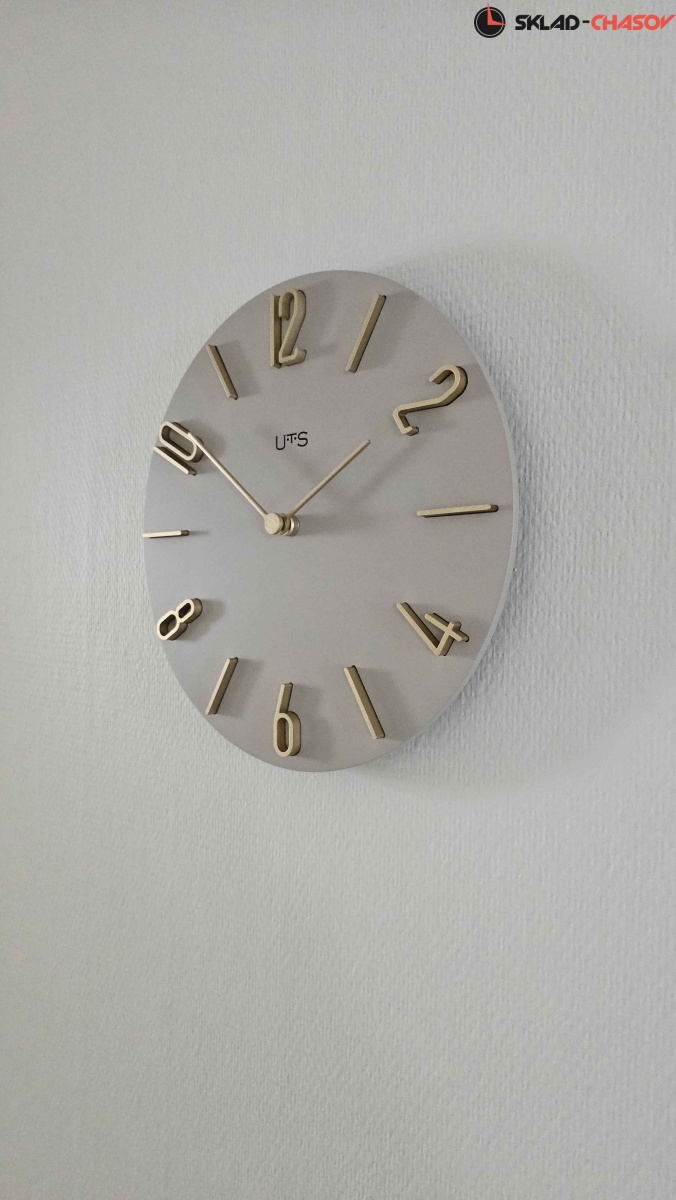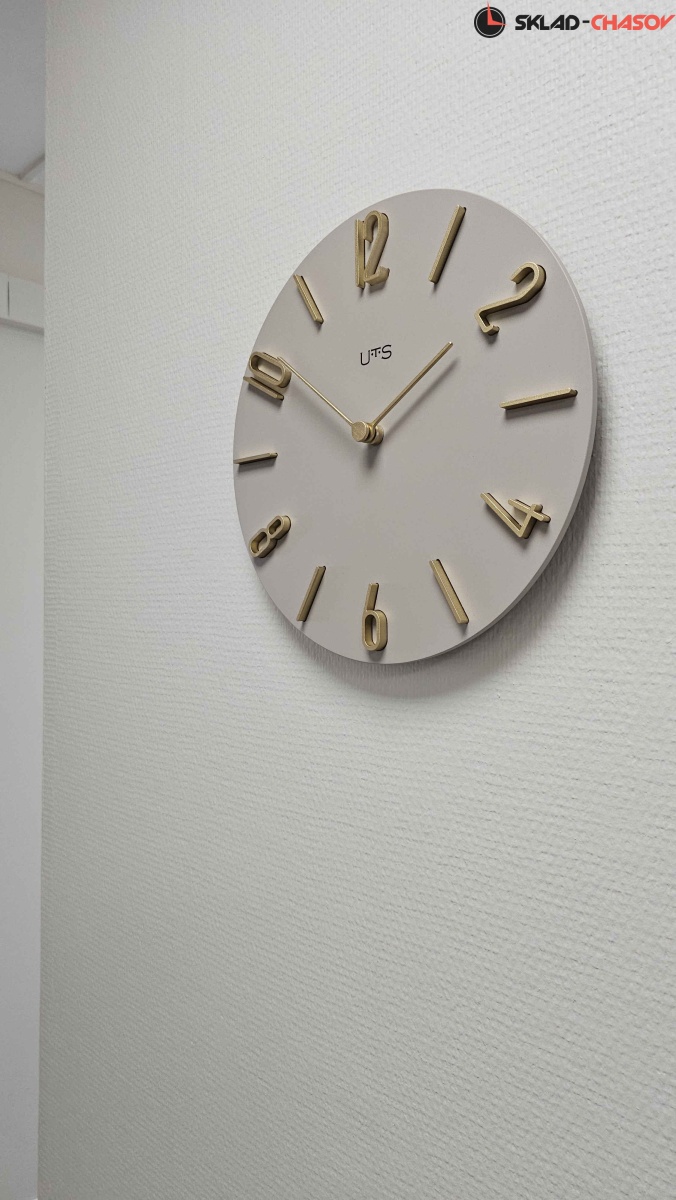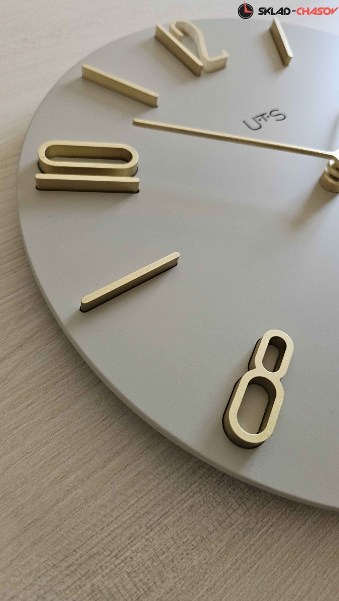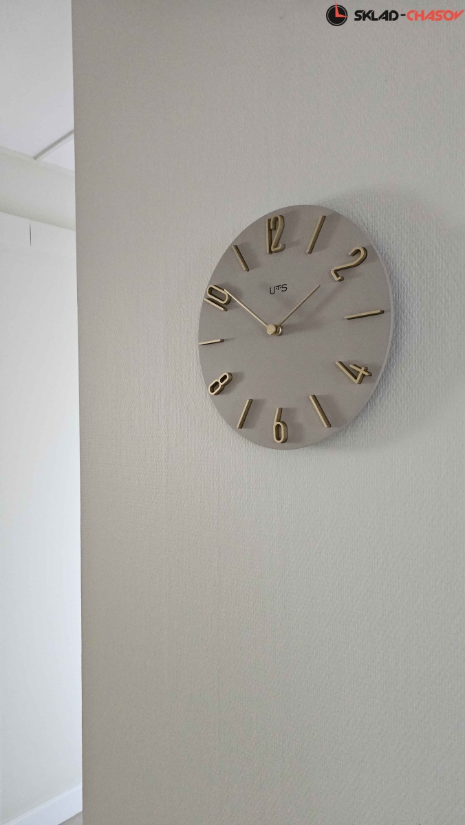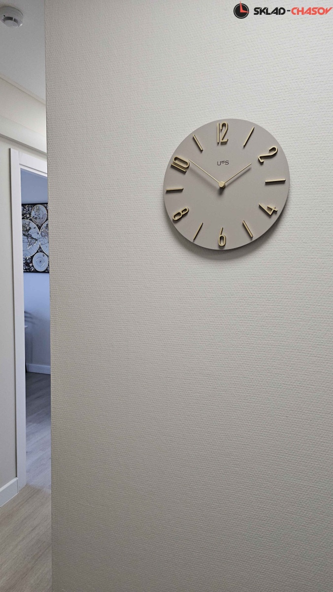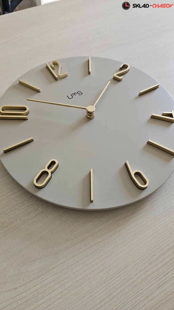 Кварцевые настенные часы с современном стиле. Корпус из МДФ с эмалью в серо-бежевом оттенке. Объемные арабские цифры выполнены в золотом цвете и аккуратно утоплены в специальных ложементах. В часах установлен бесшумный, точный и надежный механизм Young Town 12888 c плавным ходом. Необходим 1 элемент питания типа АА (в комплект не входит).