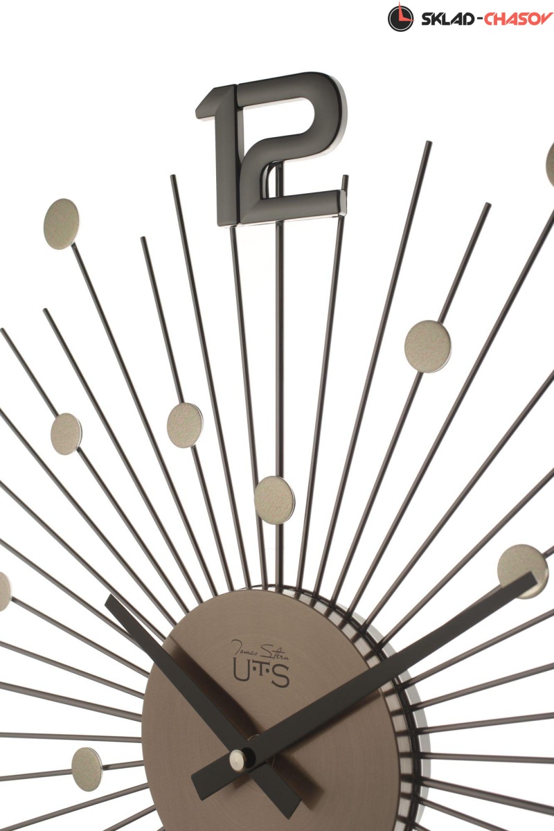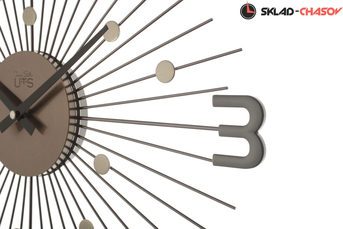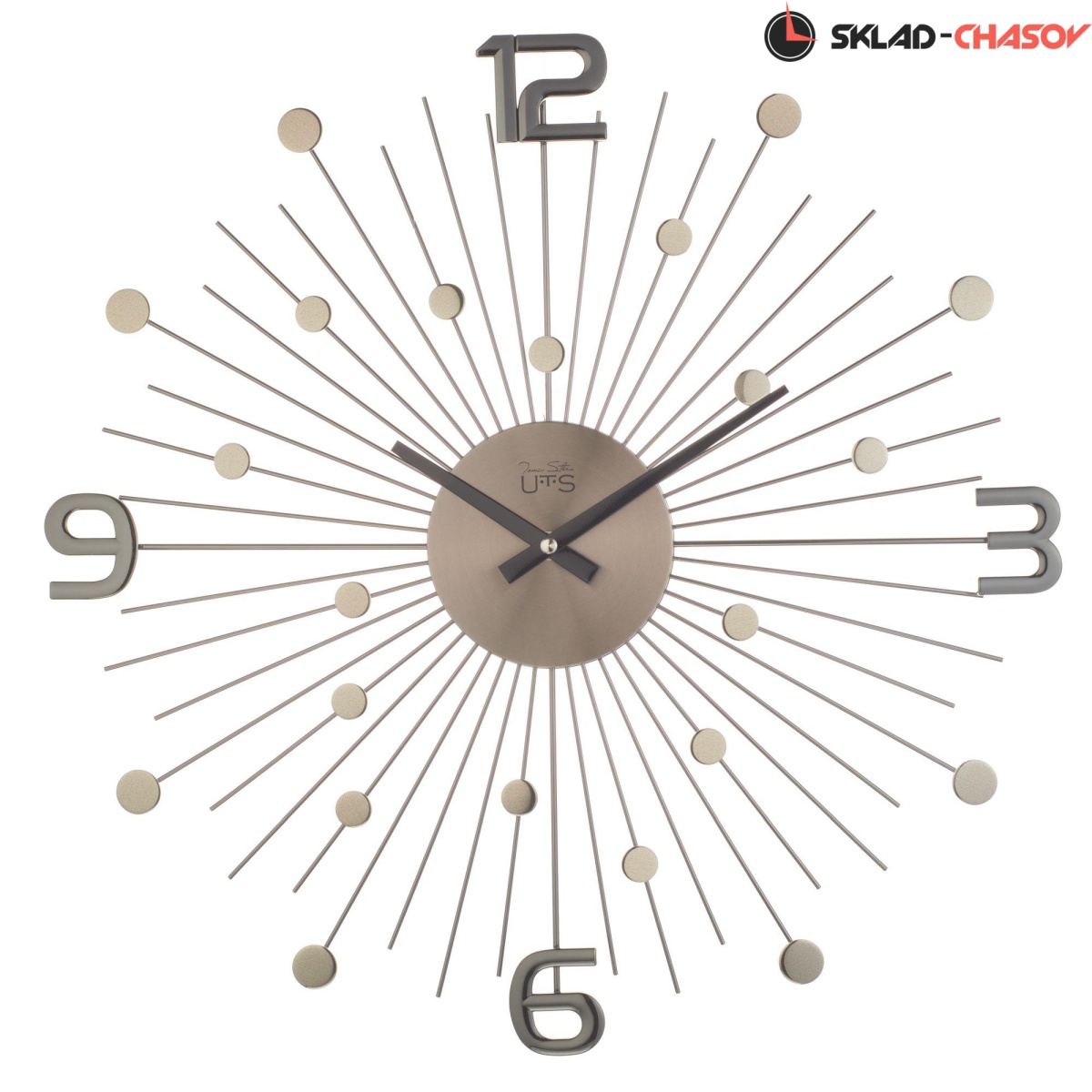 Кварцевые настенные часы в современном стиле. Металлические спицы украшены круглыми металлическими фишками сферической формы. Цифры 3, 6, 9 и 12 выполнены из глянцевого пластика. Механизм с плавным ходом. Необходим 1 элемент питания типа АА (в комплект не входит).