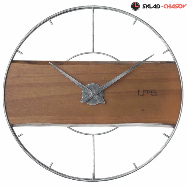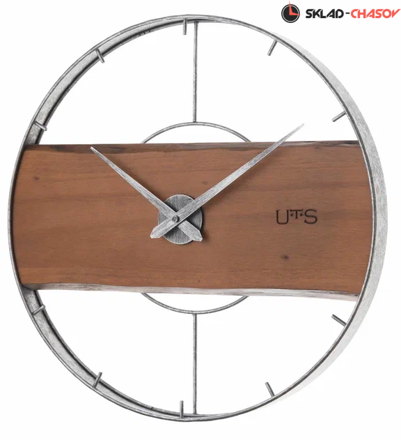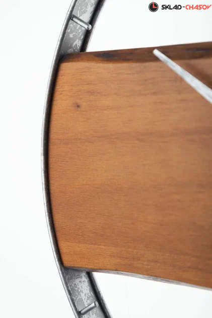 Оригинальные кварцевые настенные часы. Центральная часть корпуса выполнена из массива дерева и тонирована в цвете акация. Обод часов выполен из металла и отделан с эффектом оцинковки. Прямые металлические стрелки выполнены под цвет ободка и прекрасно дополняют общий вид часов.