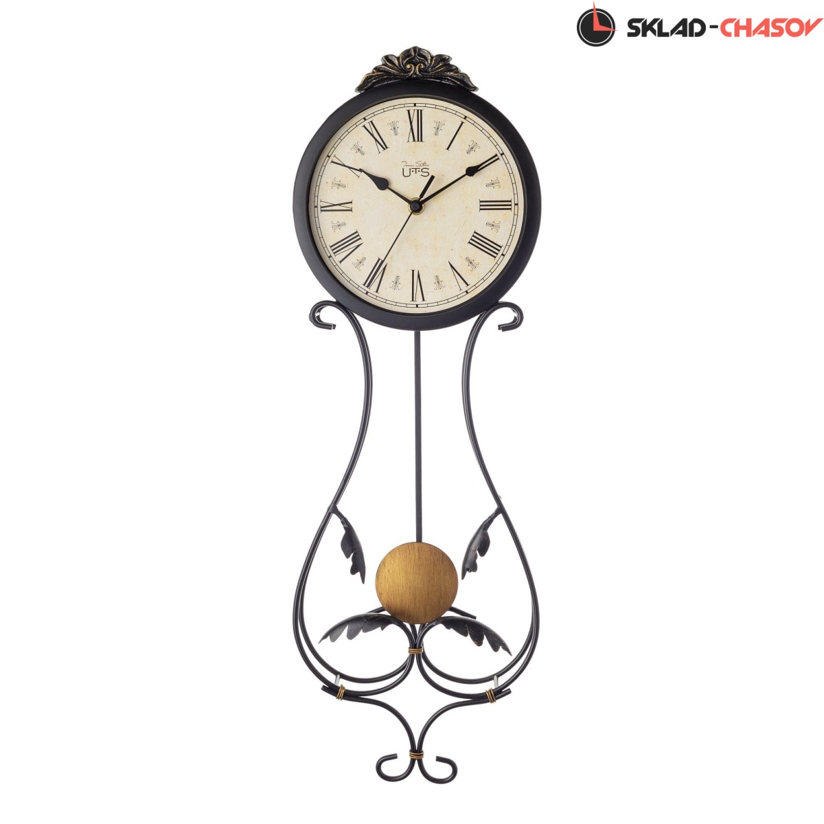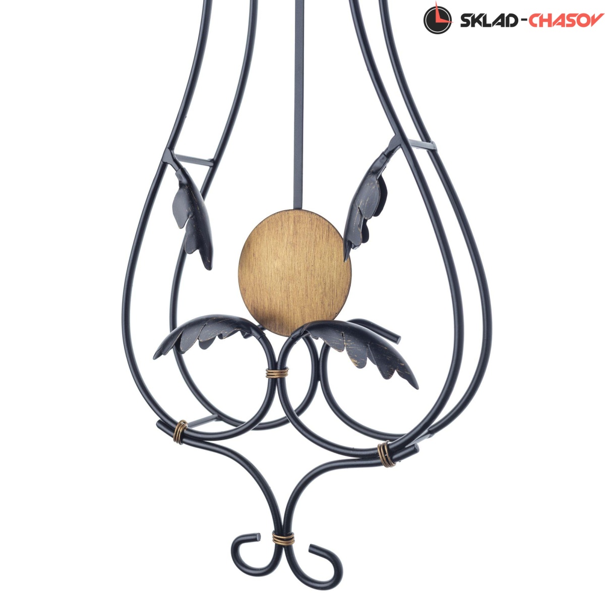Изящные настенные часы с маятником. Корпус выполнен из кованного металла и тонирован в черном цвете. Некоторые элементы корпуса проработаны золотистой патиной. Циферблат часов искусствено состарен, украшен изящной римской оцифровкой и закрыт сферическим акриловым стеклом. В часах установлен тихий, точный и надежный механизм Young Town 12888 c дискретным ходом. Необходимо 2 элемента питания типа АА (в комплект не входит).