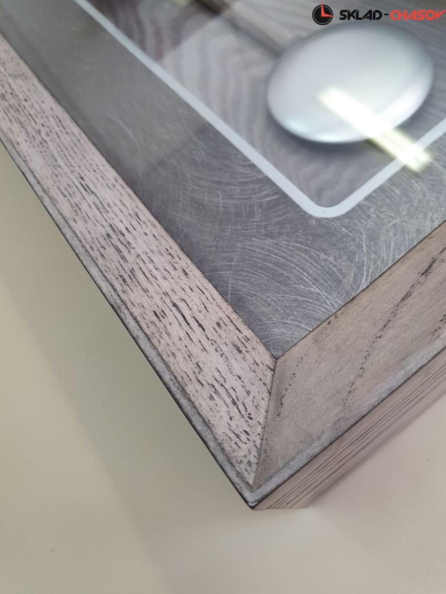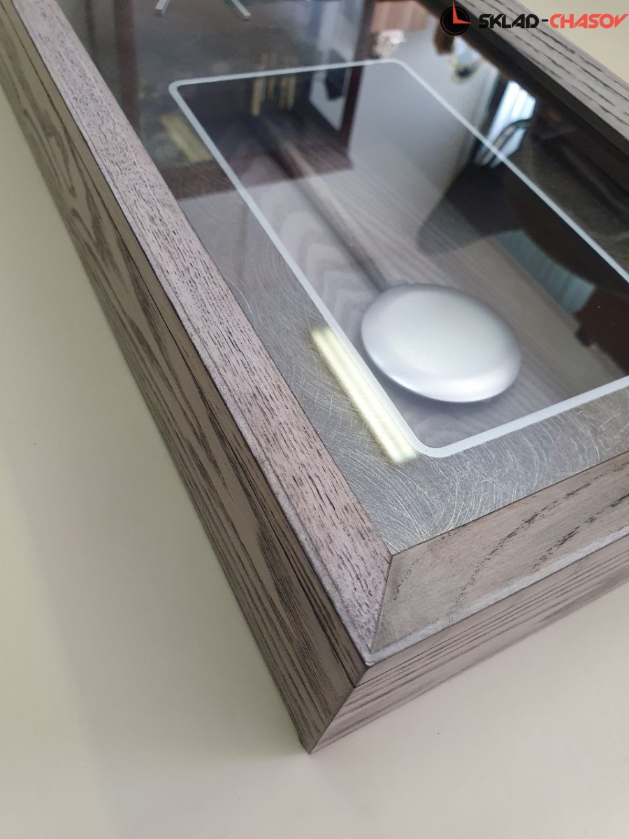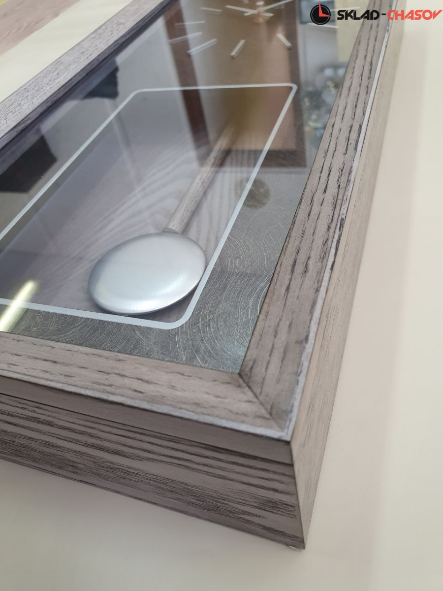 Корпус часов выполнен из МДФ и покрыт шпоном, отделаным в сером цвете, с сохранением структуры дерева.