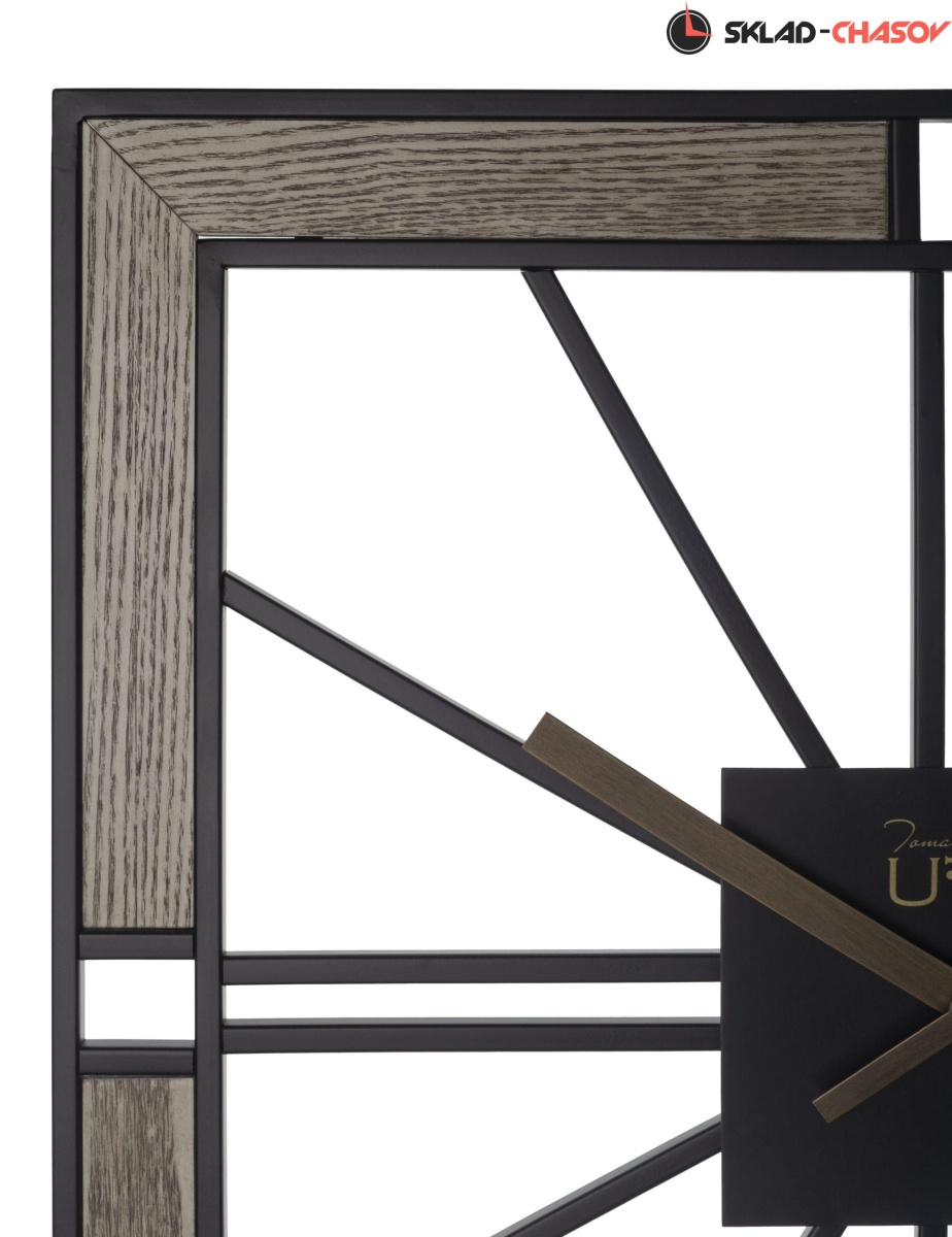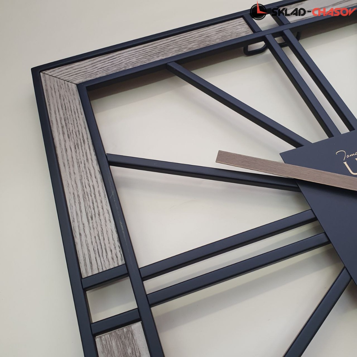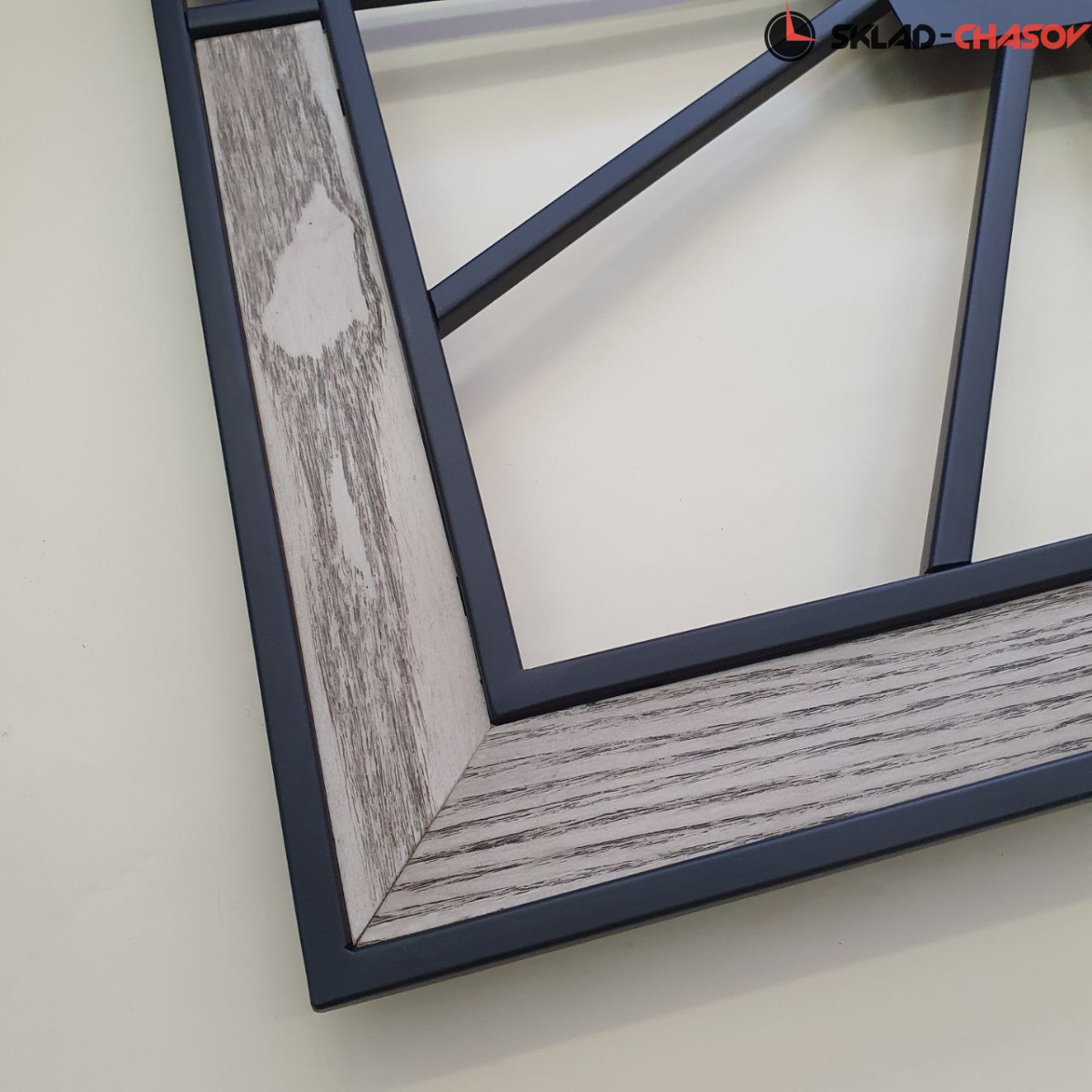 Основная часть корпуса выполнена из металла и тонирована в черном цвете. Углы часов декорированы шпонированными вставками из МДФ, тонированными в сером цвете с сохранением структуры дерева.