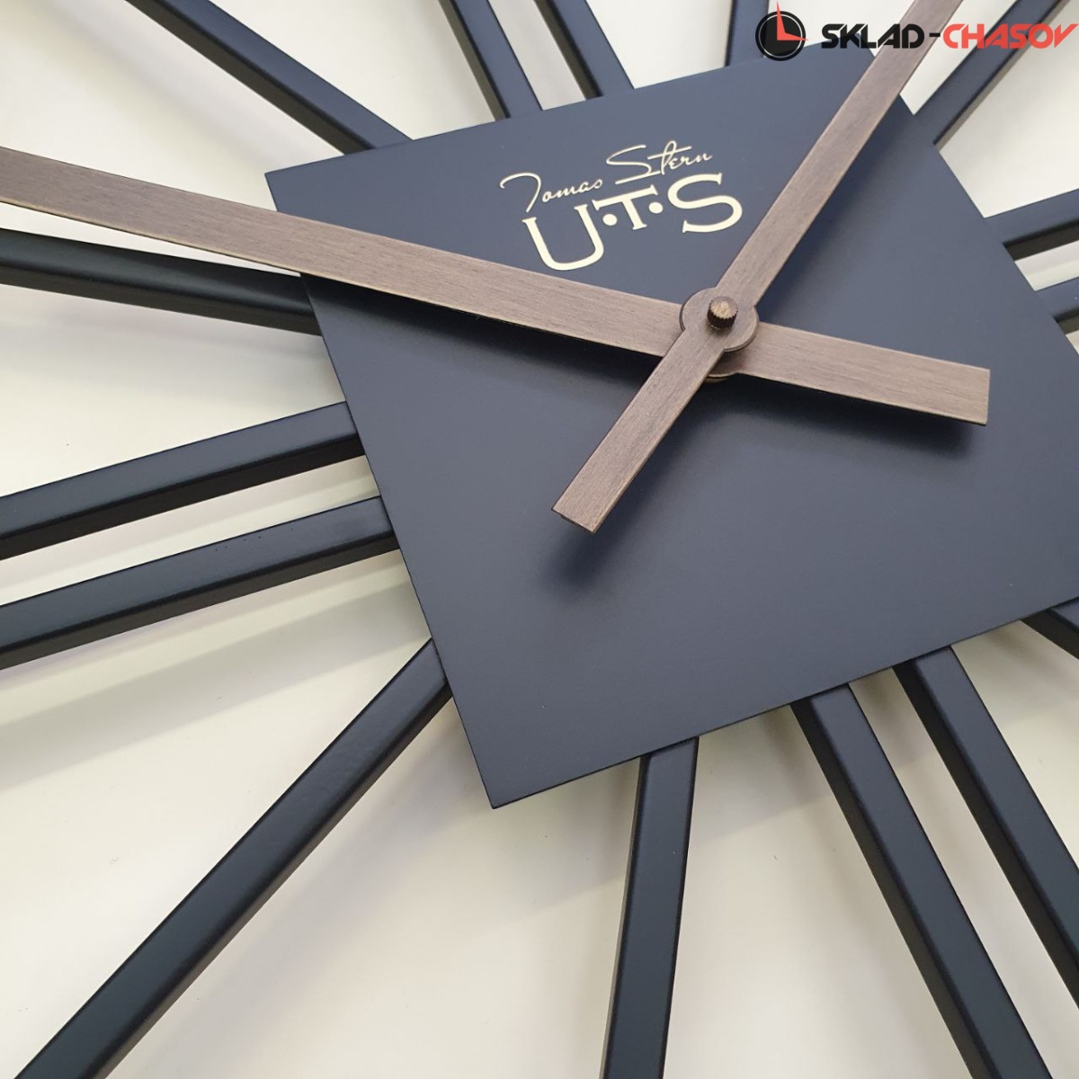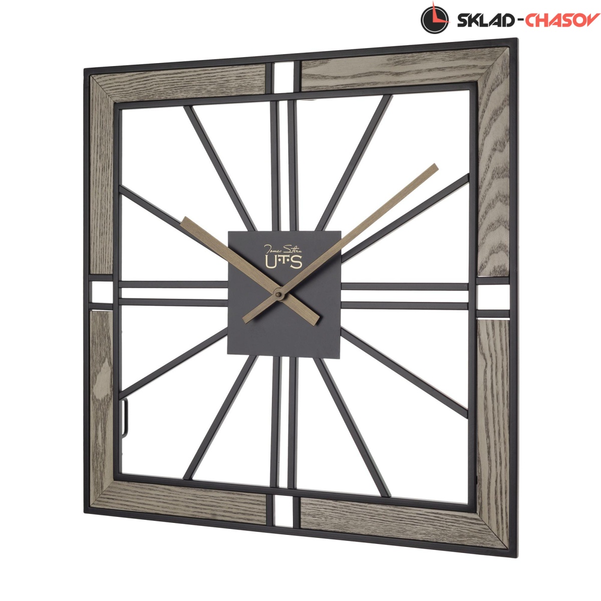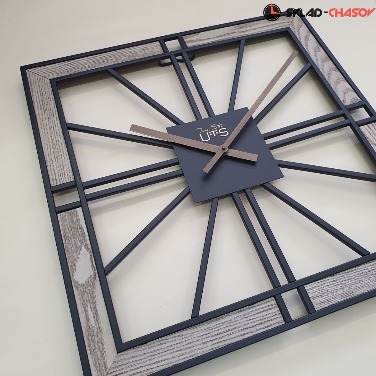 Основная часть корпуса выполнена из металла и тонирована в черном цвете. Углы часов декорированы шпонированными вставками из МДФ, тонированными в сером цвете с сохранением структуры дерева.