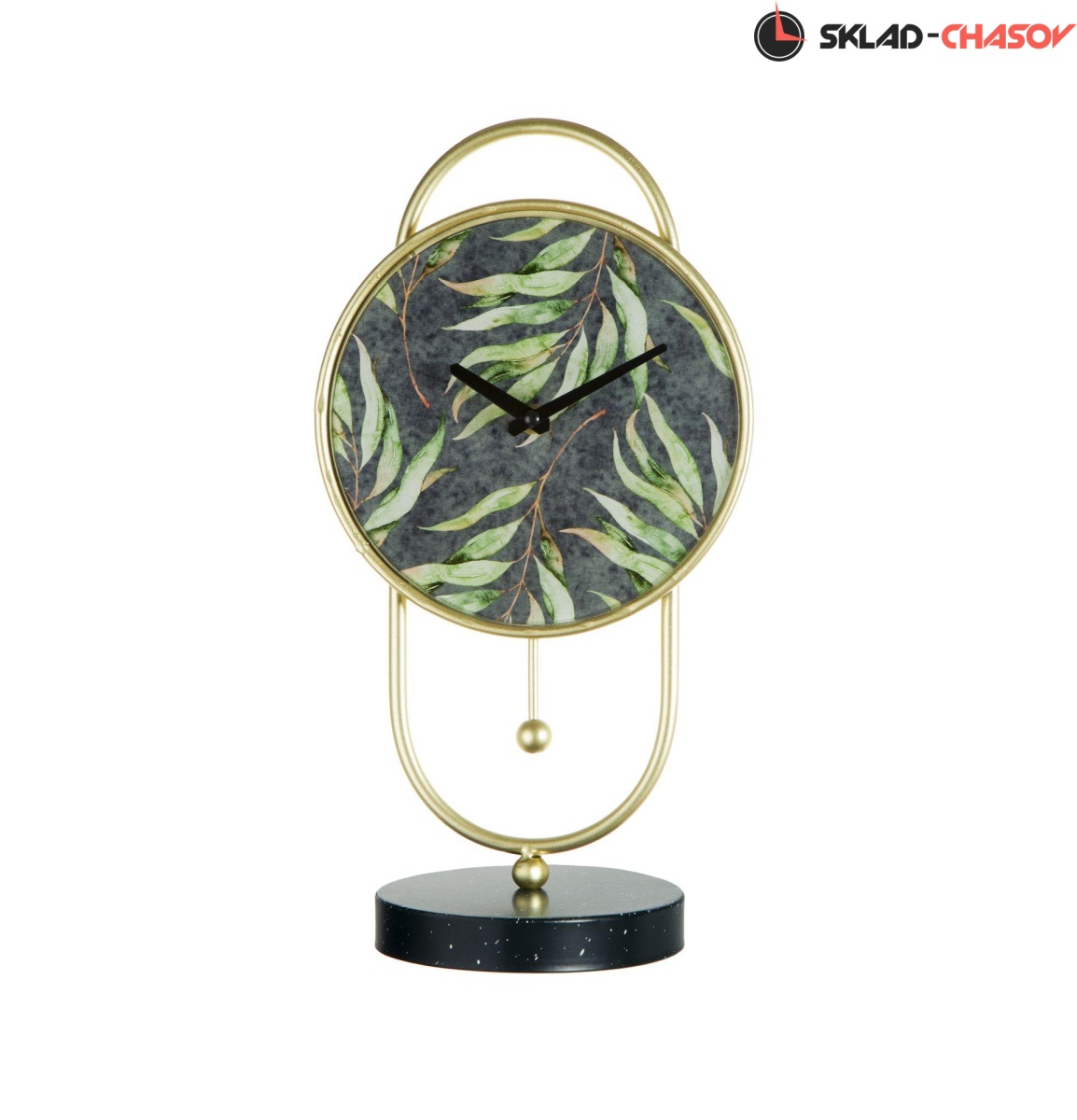 Кварцевые настольные часы в металлическом корпусе и циферблатом из стекла, с нанесенным на него тропическим принтом. Диаметр циферблата 19,5 см. В часах установлен совершенно бесшумный механизм Young Town с плавным ходом.