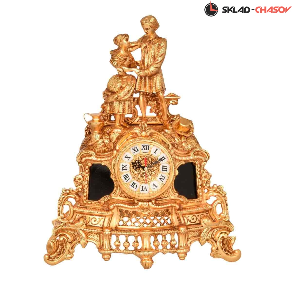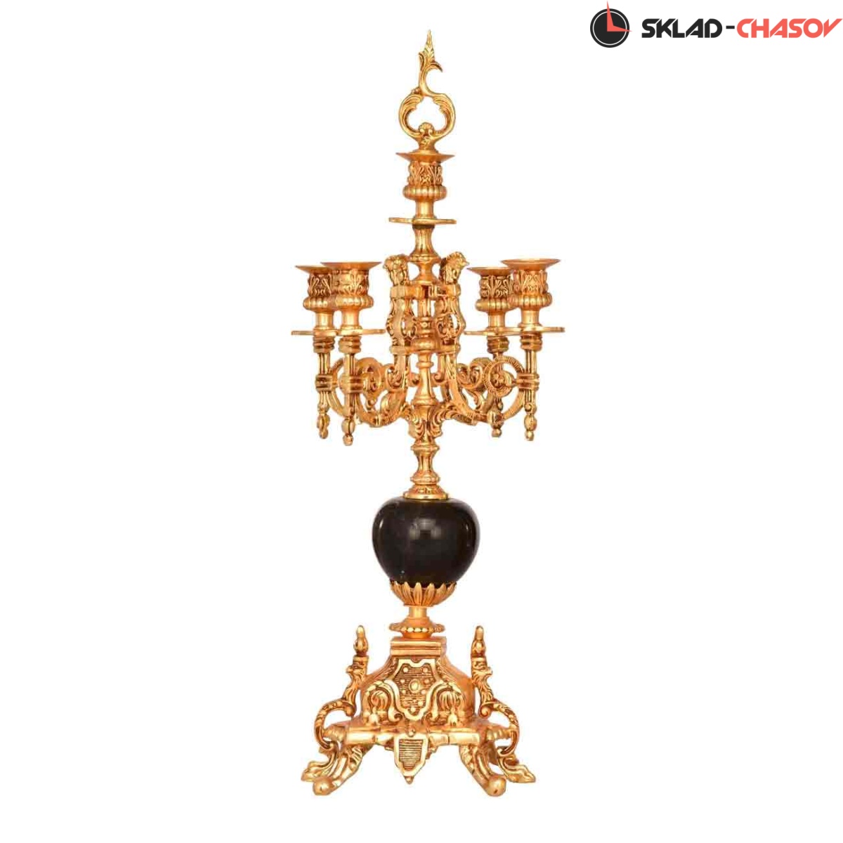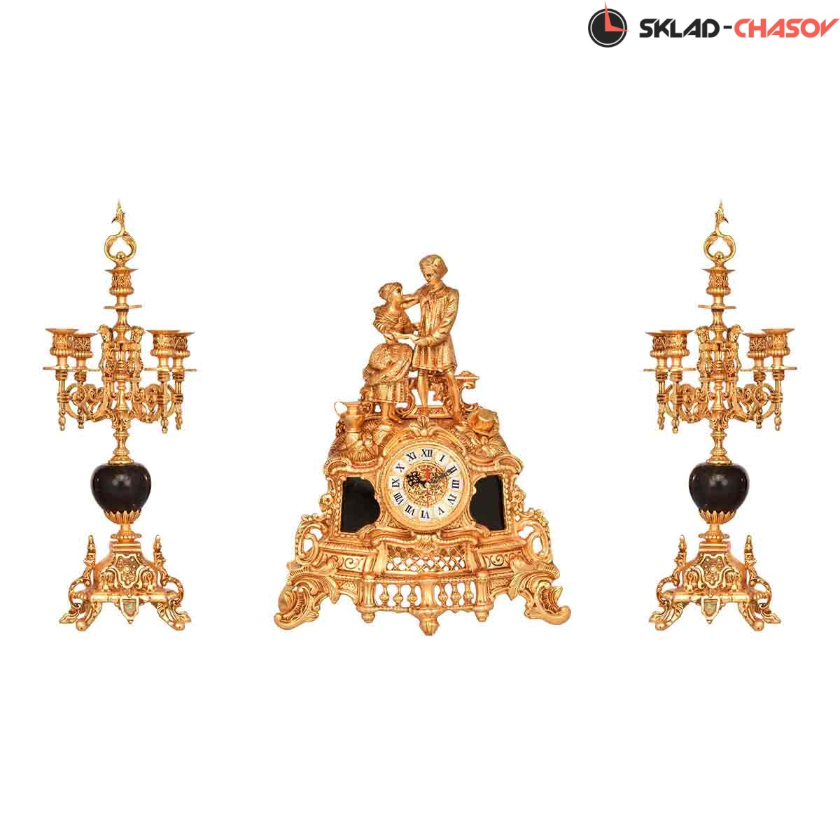 Размеры часов: Высота: 45 см. Ширина 32 см. Размеры канделябров: Высота: 43 см. Ширина 22 см. Декоративный элемент: оникс