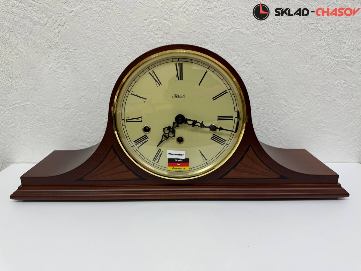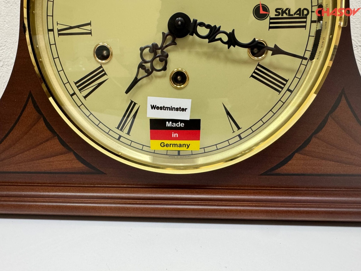Материал корпус - дерево. Цвет - орех. Длительность завода 8 дней. Бой каждый час, 3 мелодии (Westminster, Whittington, st. Michael) каждые четверть часа. Регулятор - плавающий баланс. Автоматическое отключение боя и мелодии на ночь.