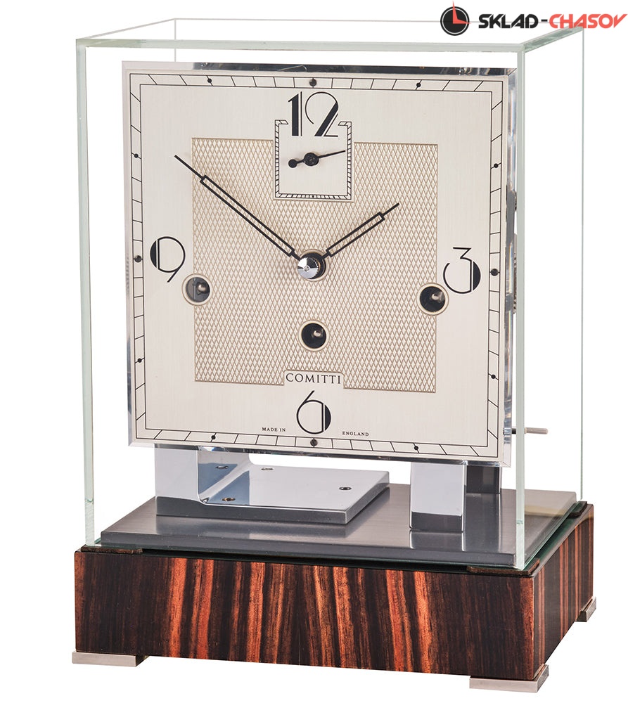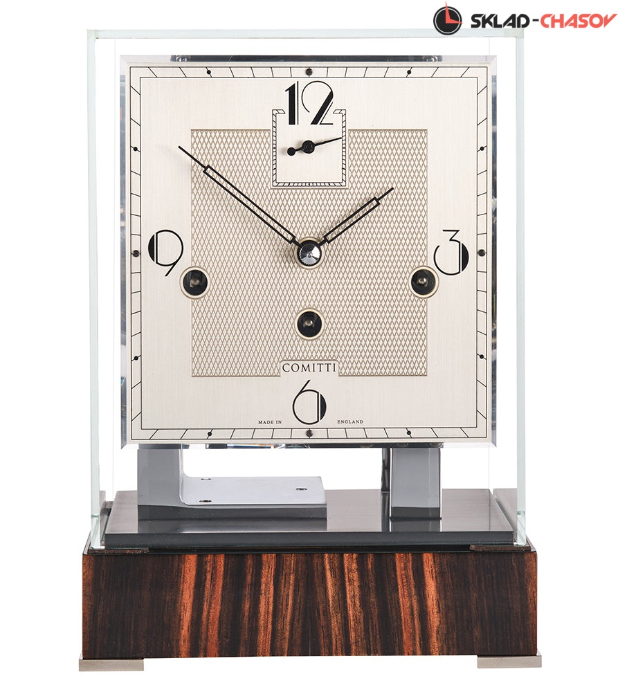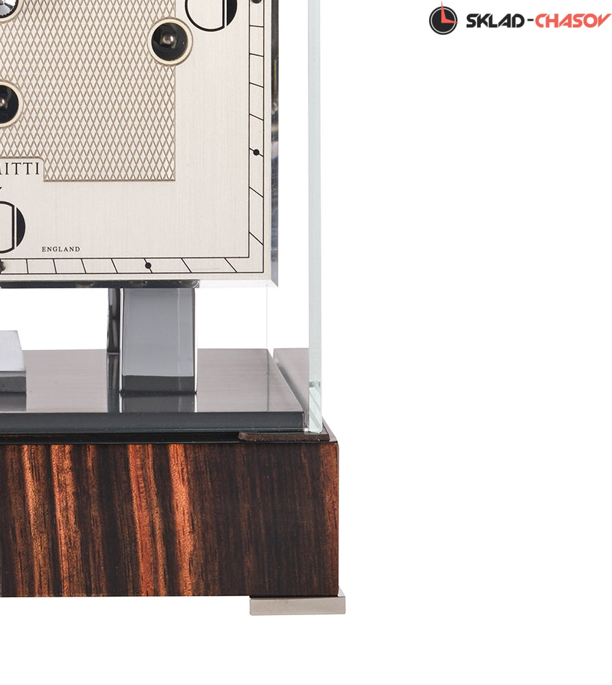 Современный дизайн в стиле ар-деко. Хромированный механизм с тройным звонком полностью раскрыт и защищен колпачком из минерального стекла. Глянцевое основание из макассара, отполированное вручную.
