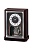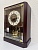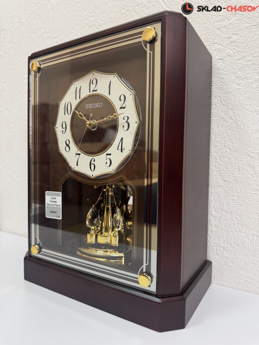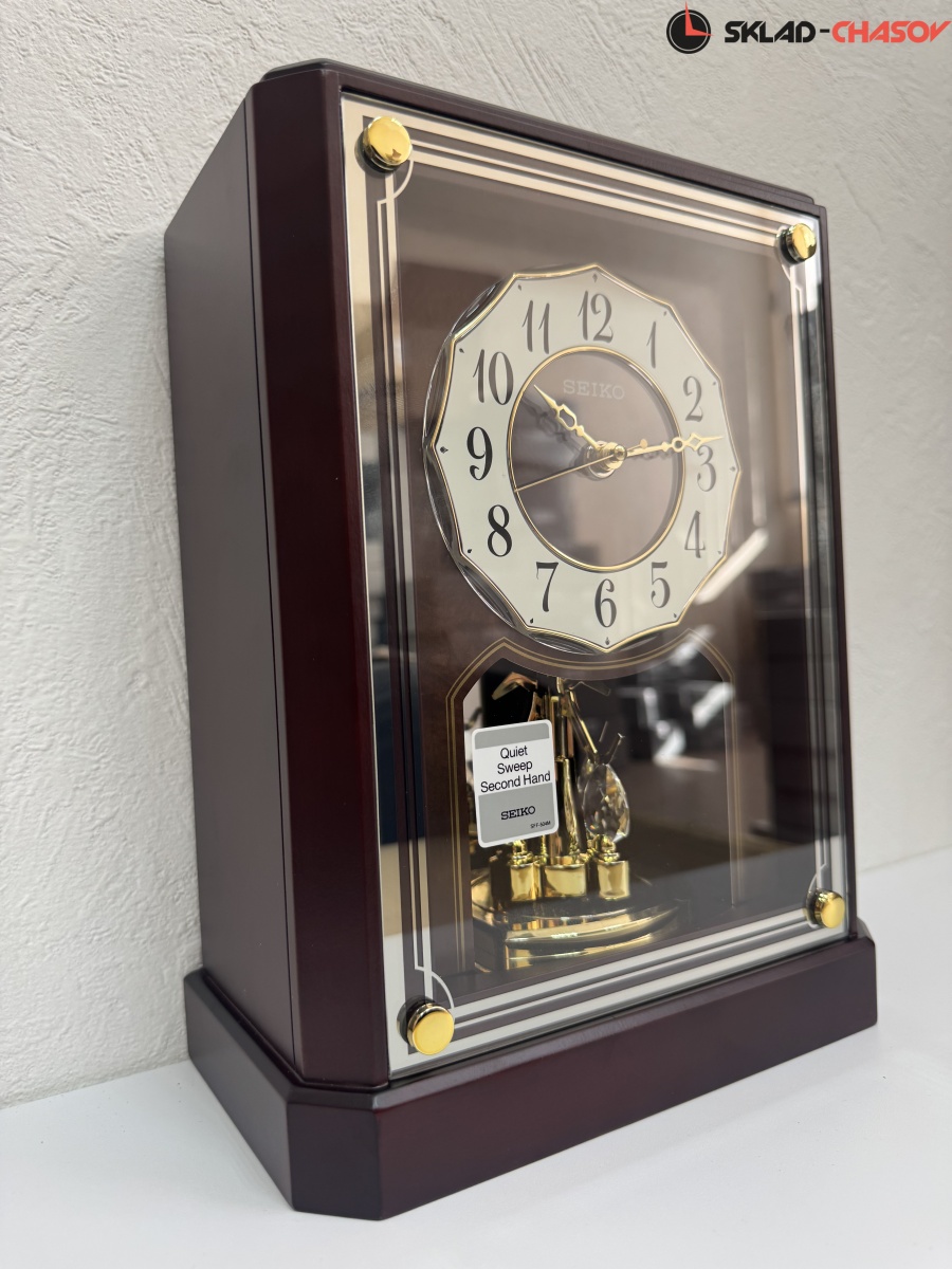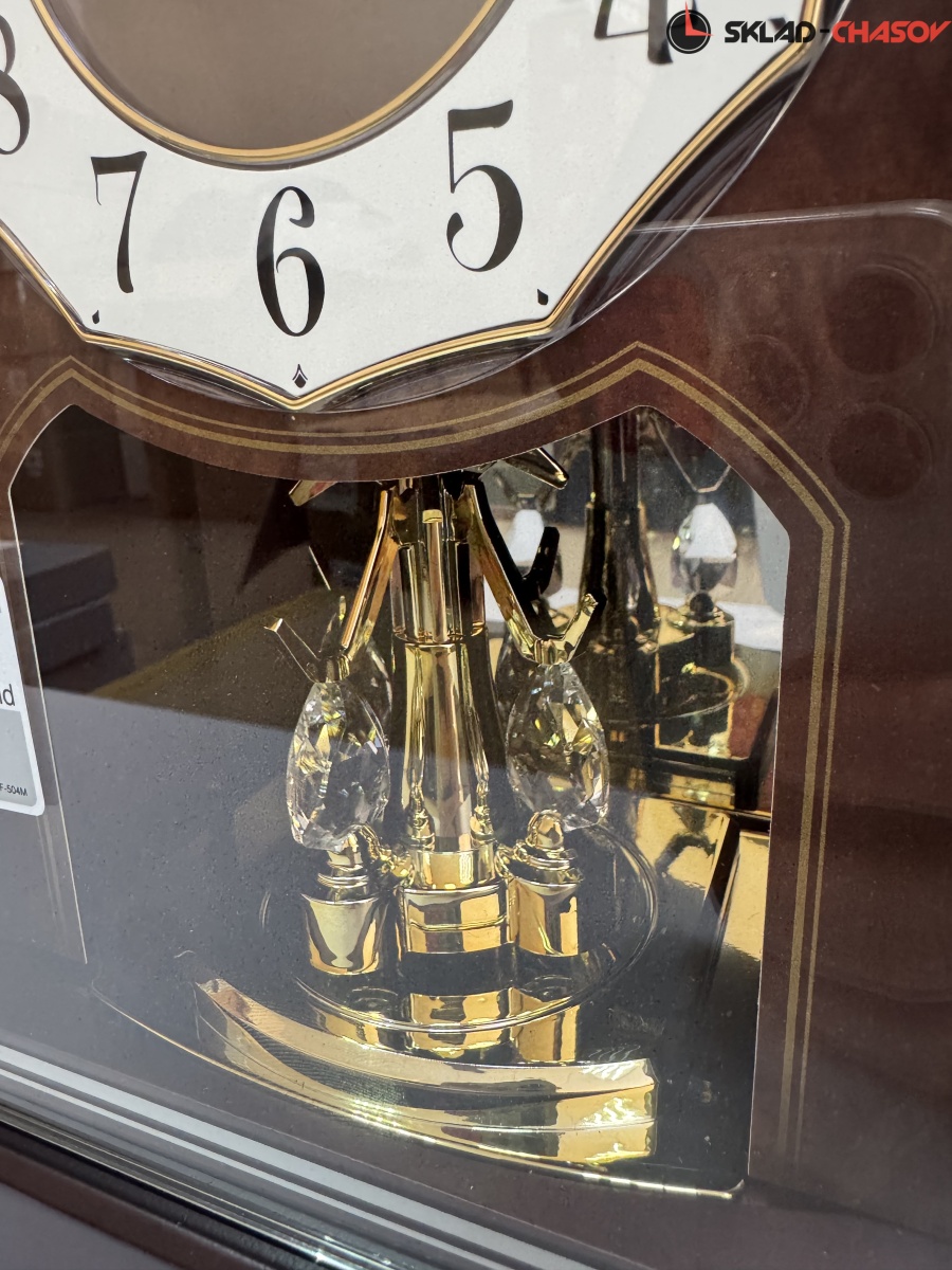 Коричневые кварцевые настольные часы с аналоговым циферблатом (стрелки). Стрелки: золотистая часовая, золотистая минутная и золотистая секундная. Циферблат бежевый с арабскими цифрами. Ниже циферблата расположился вращающийся маятник. Корпус выполнен из дерева. Бесшумный механизм.