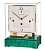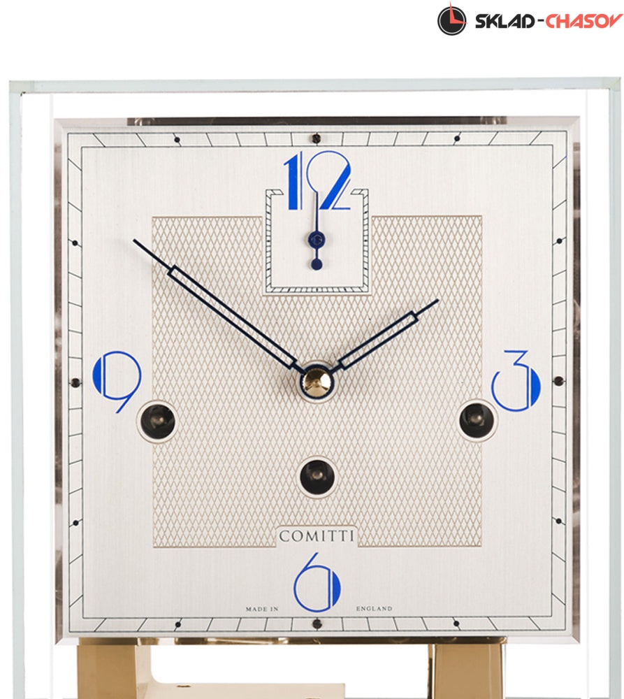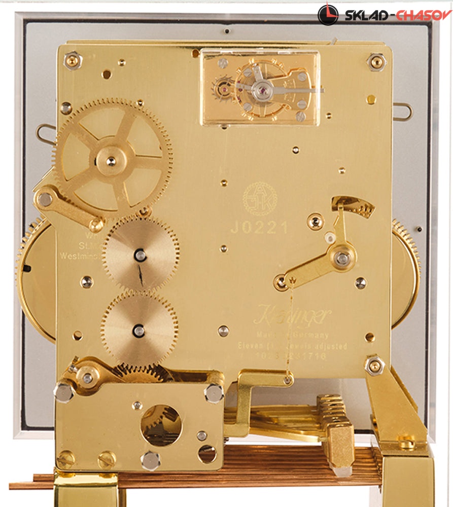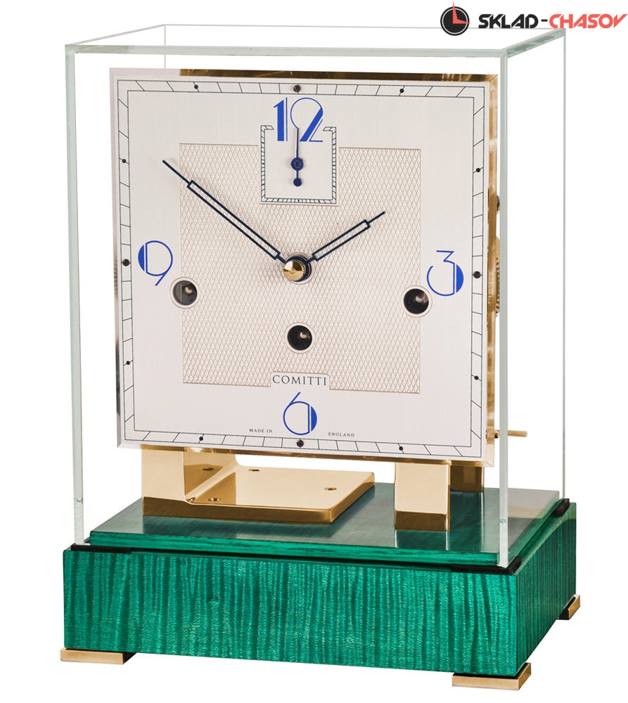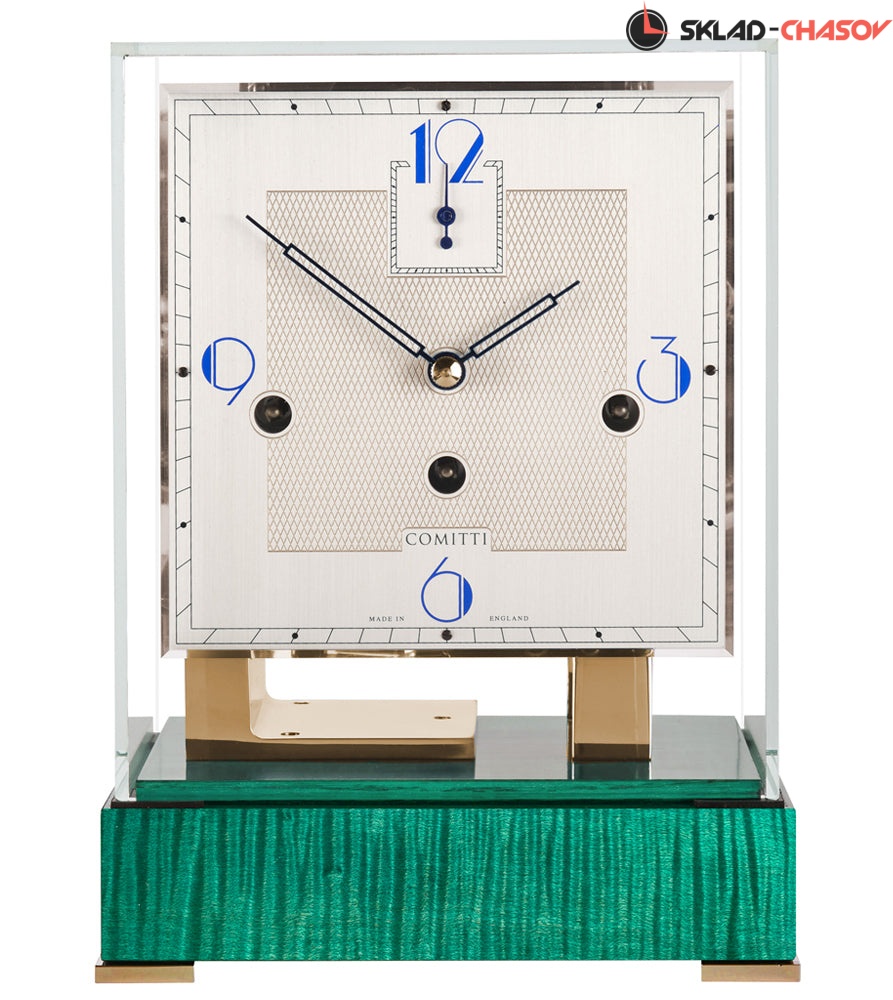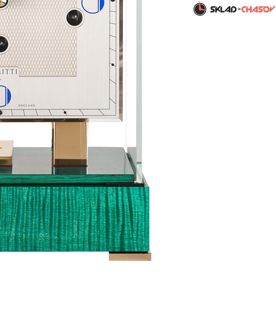 Современный дизайн в стиле ар-деко. Механизм с тройным звоном из полированной латуни полностью раскрыт и защищен колпачком из минерального стекла. Глянцевое основание из зеленого клена.