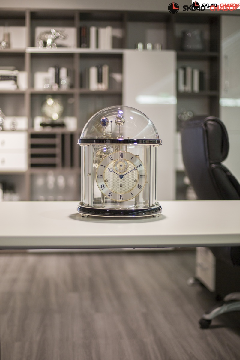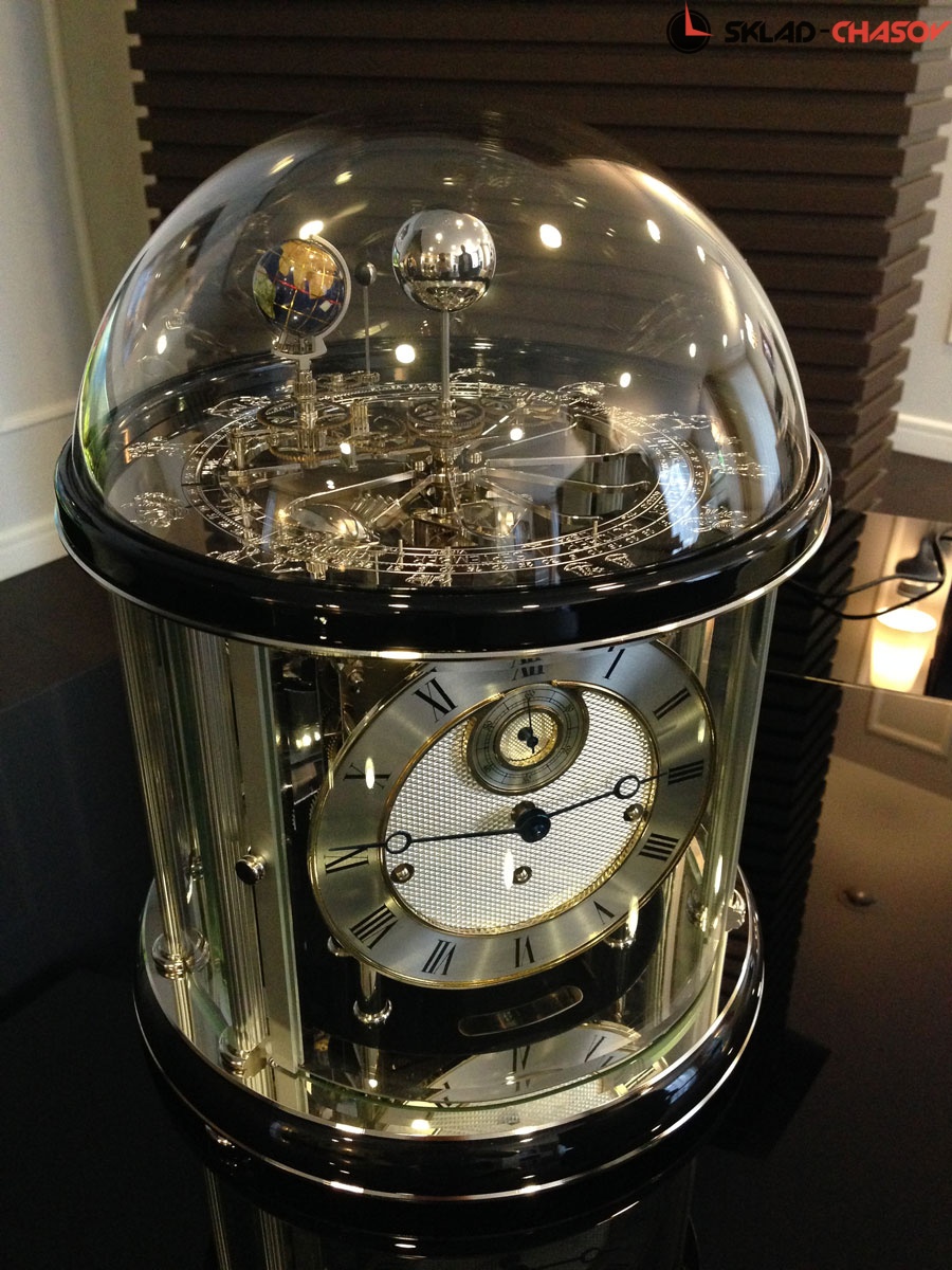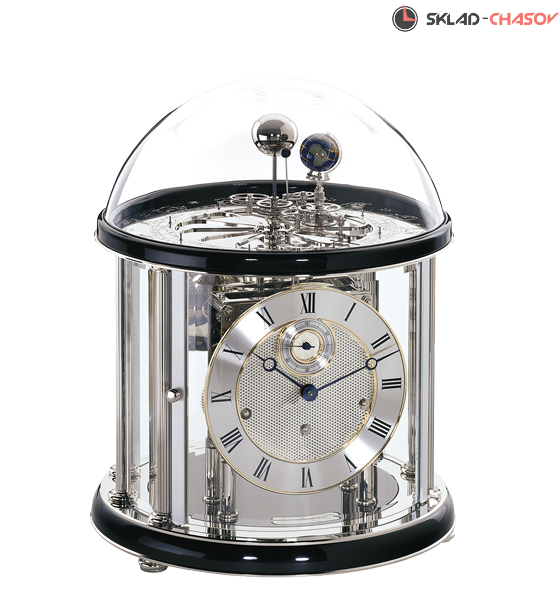 Часы настольные механические Hermle Tellurium II 22823-740352 с боем и мелодией. Бой каждый час по количеству полных часов, мелодия каждые четверть часа , 1/4-часовой Вестминстерский перезвон.Механизм пружинный с 8-ми дневным заводом. Автоматическое отключение мелодии на ночь.Швейцарский регулятор хода на 11 камнях. Модель солнечной системы со знаками зодиака.Отдельно вынесена секундная стрелка.Модель "Теллуриум" воспроизводит ежегодное вращение Земли вокруг Солнца, а также суточное вращение земли вокруг своей оси. Луна, в свою очередь, оборачивается вокруг Земли за 29.5 дней, заканчивая полный лунный месяц. В течение года земля проходит все 12 знаков зодиака. На латунном диске отображается дата, месяц и соответствующий знак зодиака. Уникальные настольные часы, которые завораживают даже самых чуждых к часовому искусству людей! Размер часов: 34.9х28.9х28.9 см. Материал: дерево (черное дерево), металл, стекло. Производство: Германия. Гарантия: 2 года.