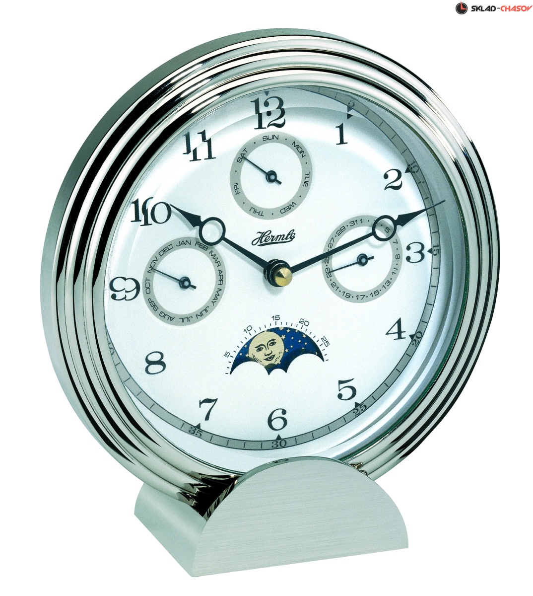 Часы в виде диска на подставке. На циферблате отдельные стрелки показывают месяц, число, день недели. Лунный календарь. Бесшумный кварцевый механизм.