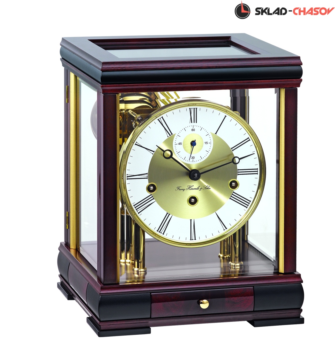 Часы настольные (каминные) механические Hermle 22998-070352 с боем и мелодией. Пружинный механизм с 8-ми дневным заводом (ключ).Бой (звон) - каждый час удары по количеству полных часов, получасовой бой, мелодия Westminster каждую четверть часа. Ручное и автоматическое отключение мелодии и боя. Оригинальный дизайн позволит вам наблюдать работу механизма с любой стороны. Секундная стрелка вынесена на отдельный циферблат. Ящичек для хранения ключа. Особенности часов часов Hermle 22998-070352:Размер часов: 30х23х21 см. Материал: красное дерево, металл, стекло. Производство: Германия. Гарантия: 2 года.