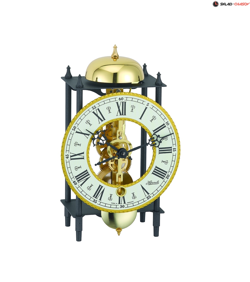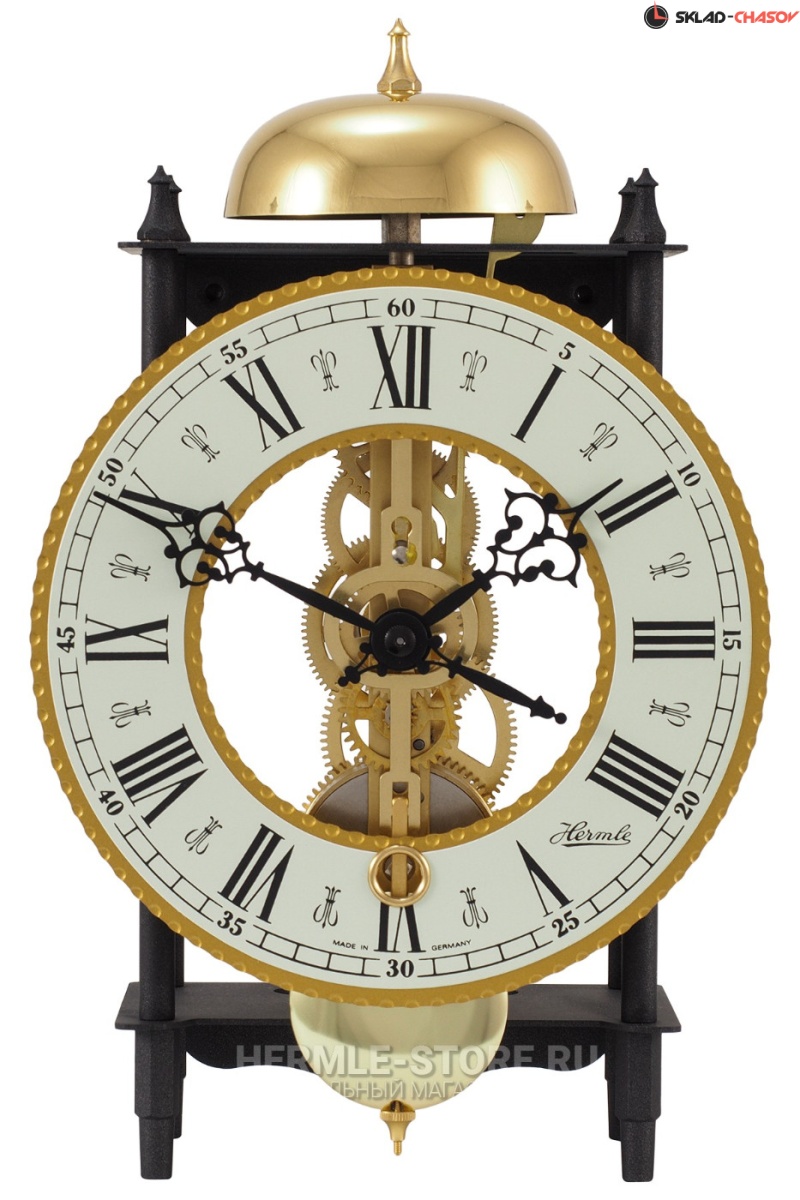 Скелетизированный корпус выполнен из латуни. Регулятор хода – маятник, запас хода 8 дней. Часы оборудованы функцией боя каждый час. Классический круглый белый циферблат, временные рамки обозначены большими римскими цифрами .