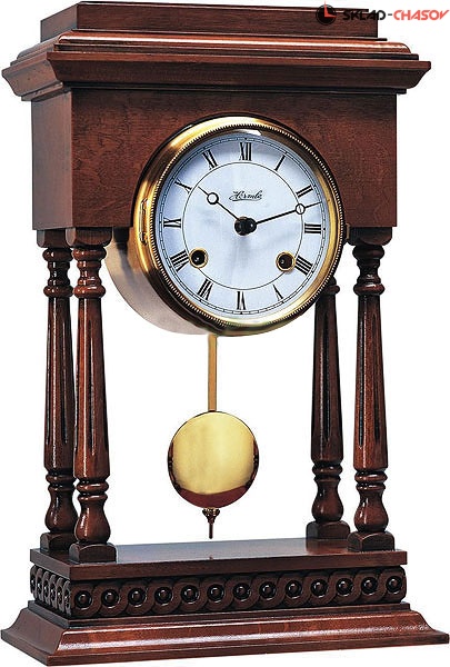 Роскошный сложный корпус с эффектом старого орехового дерева. Механические настольные часы с маятником и длительность завода до 8 дней. Эмалевый циферблат с римскими цифрами. Стрелки в стиле Бреге. Бой "Бим-Бам": в половину часа один раз и в полный час в соответствии с показанием времени. Материал: дерево. Расцветка: орех античный. Размер: 35,5x22x10 см.