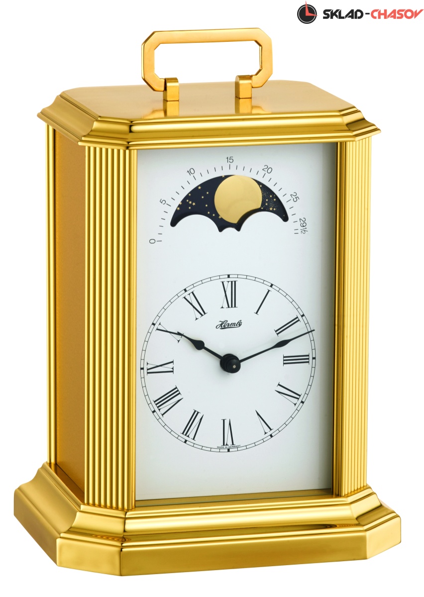 Восьмиугольный корпус часов из латуни и классическим циферблатом с лунным календарём. Длительность завода 8 дней; бой каждый час.