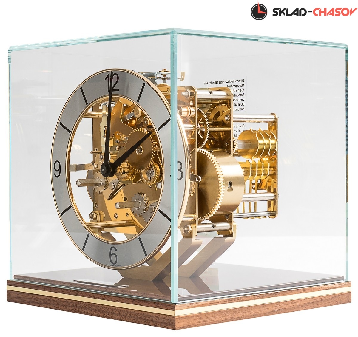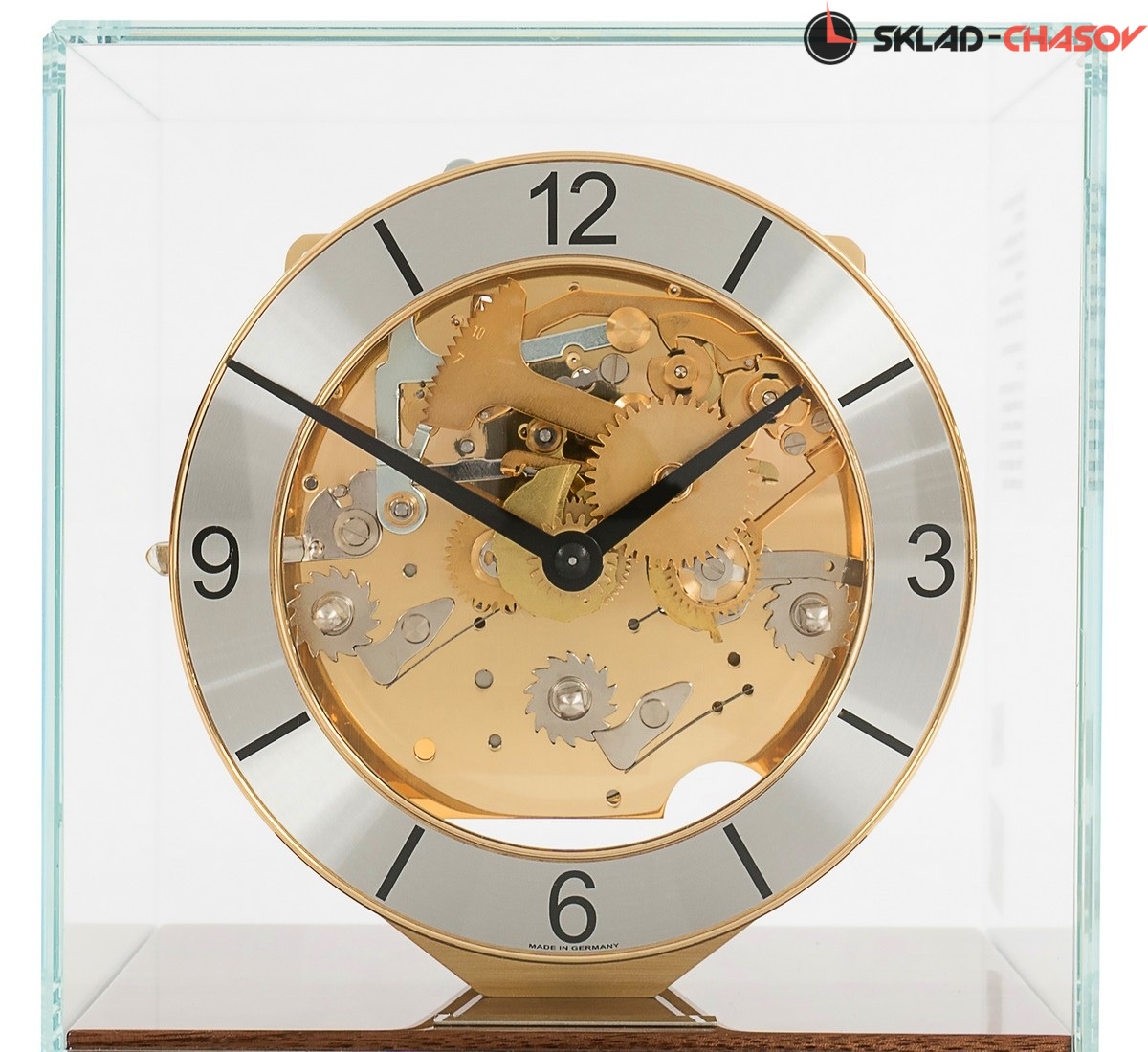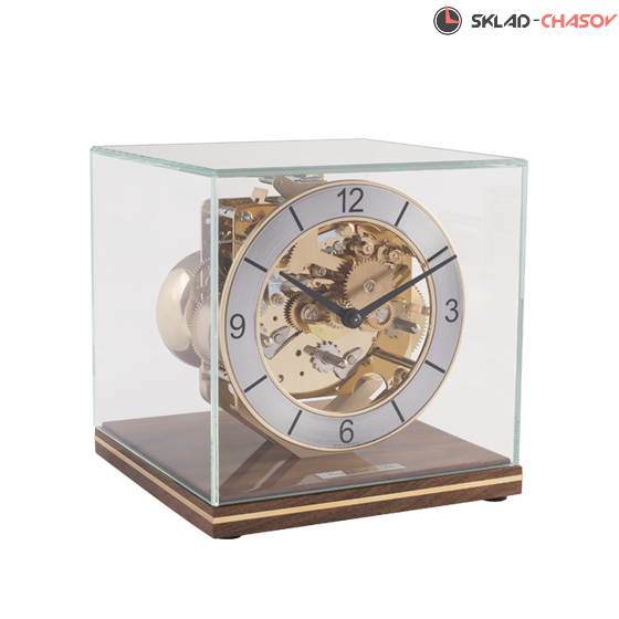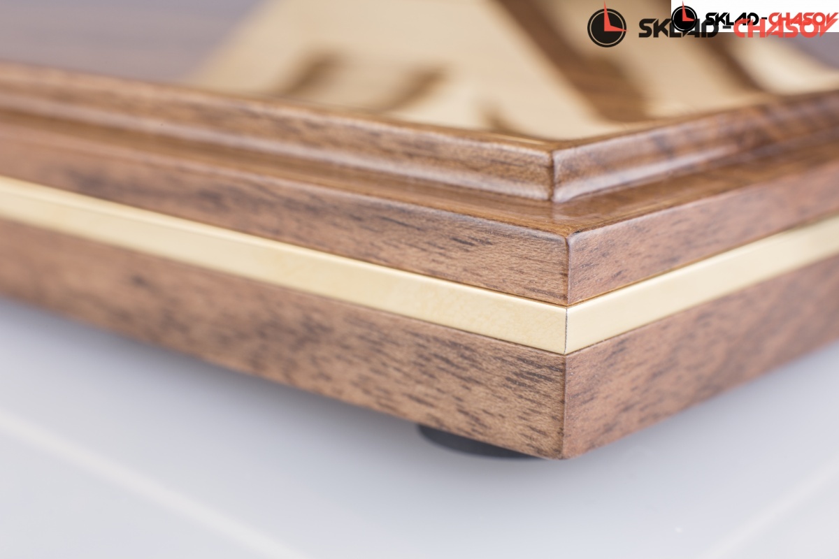 Минималистичная модель в форме куба. Ореховая подставка из полированного массива дерева с латунной вставкой по периметру. Металлический циферблат с арабскими цифрами. Купол из минерального стекла.