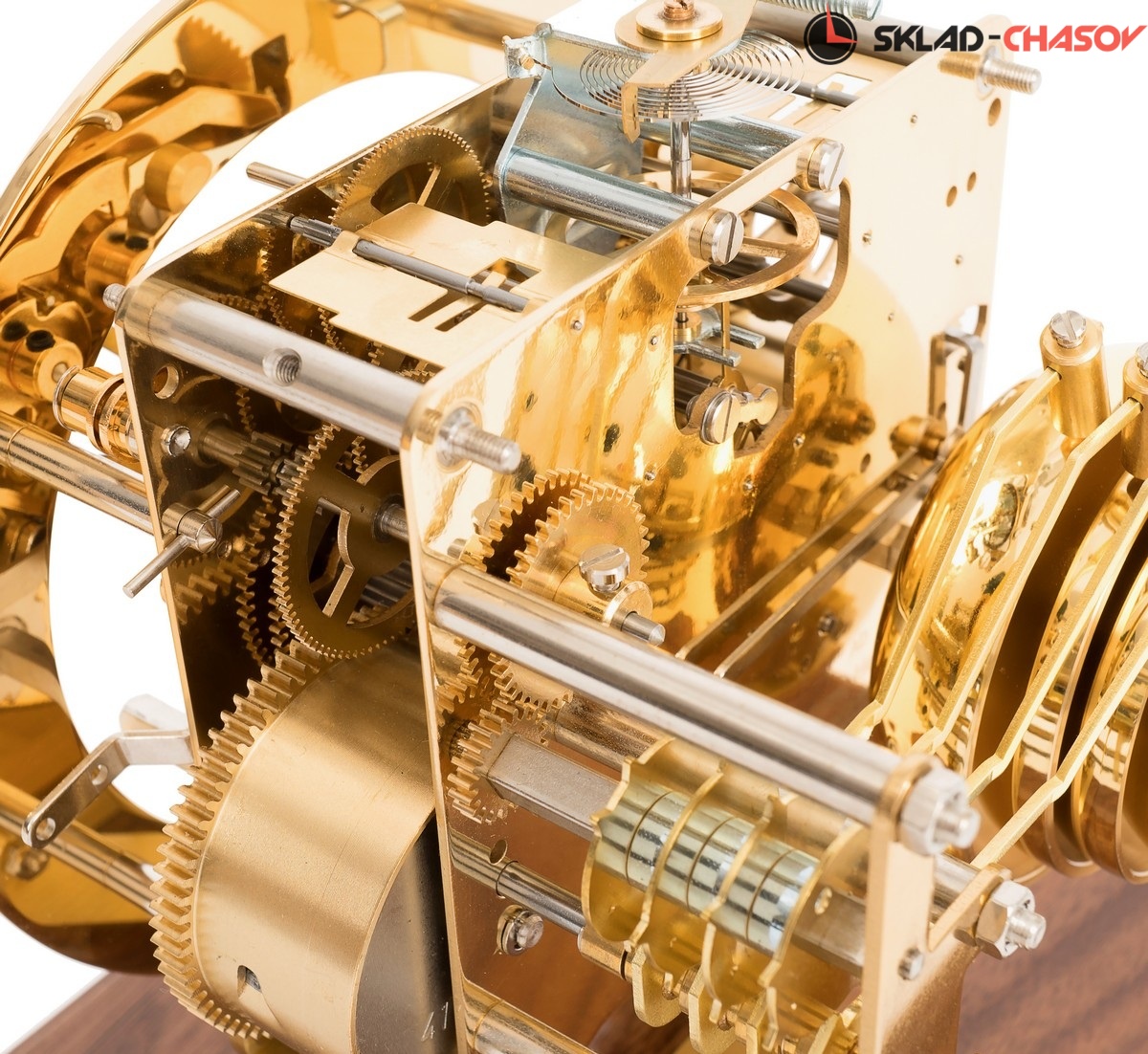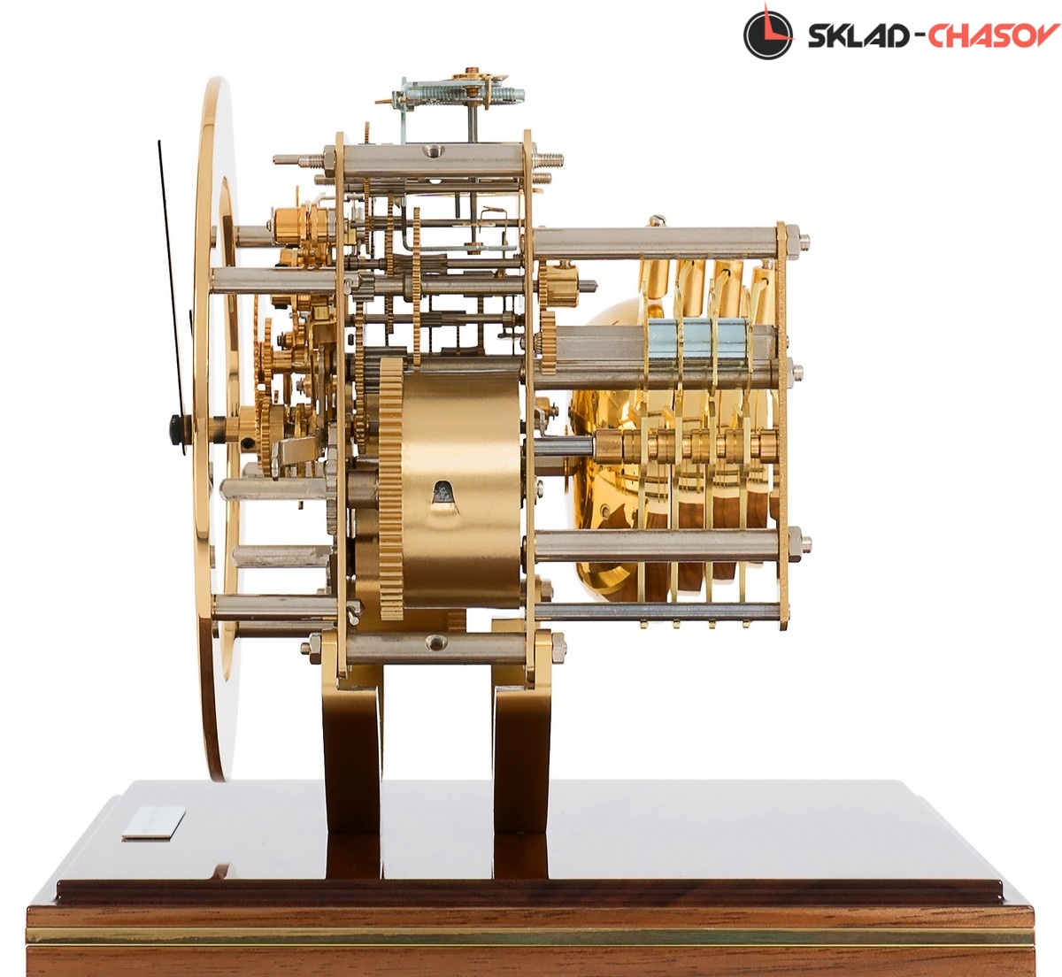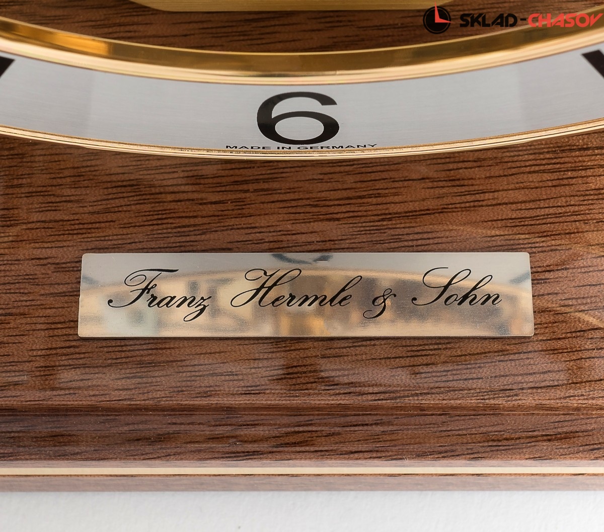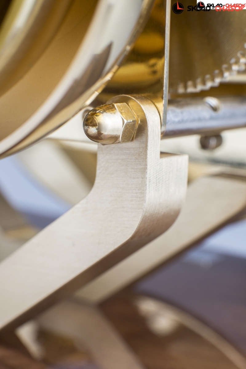 Минималистичная модель в форме куба. Ореховая подставка из полированного массива дерева с латунной вставкой по периметру. Металлический циферблат с арабскими цифрами. Купол из минерального стекла.
