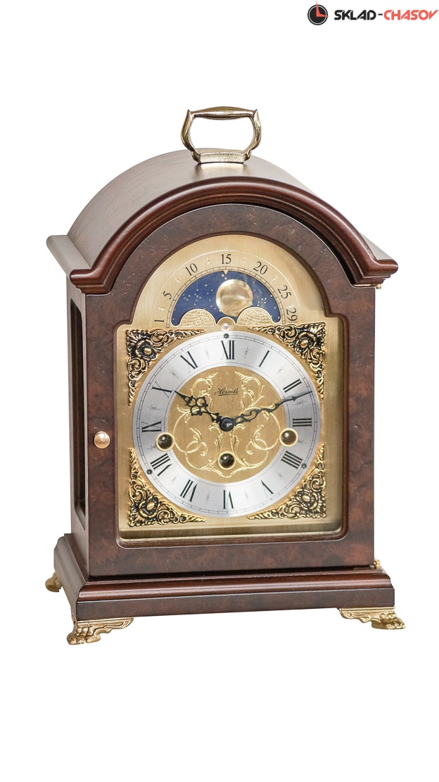 Модель каминных часов с инкрустацией корневищем ореха. В верхней части циферблата расположен лунный календарь. Корпус на изящных латунных ножках. Боковины со стеклянными окнами, через которые видна работа механизма.