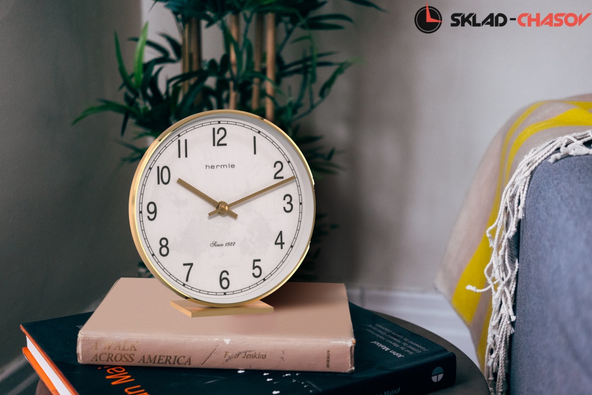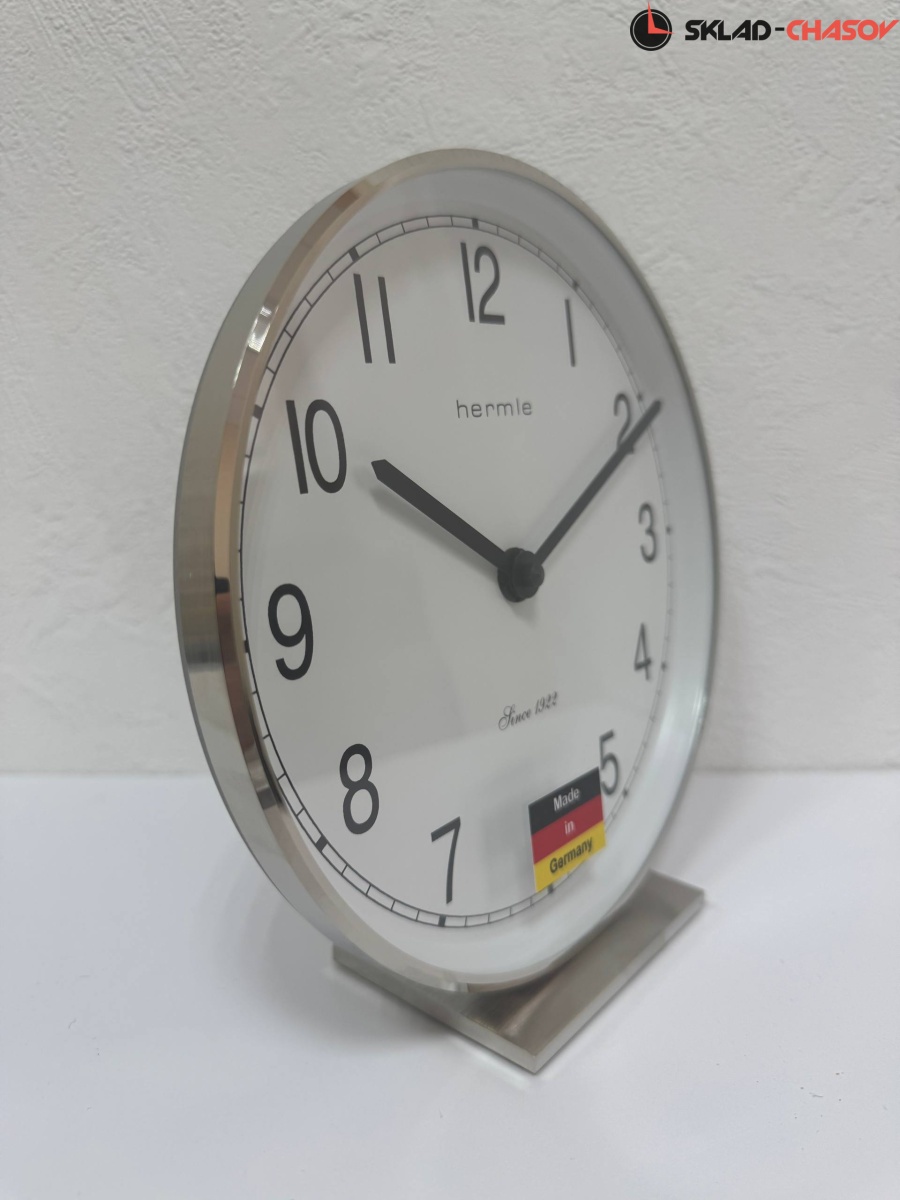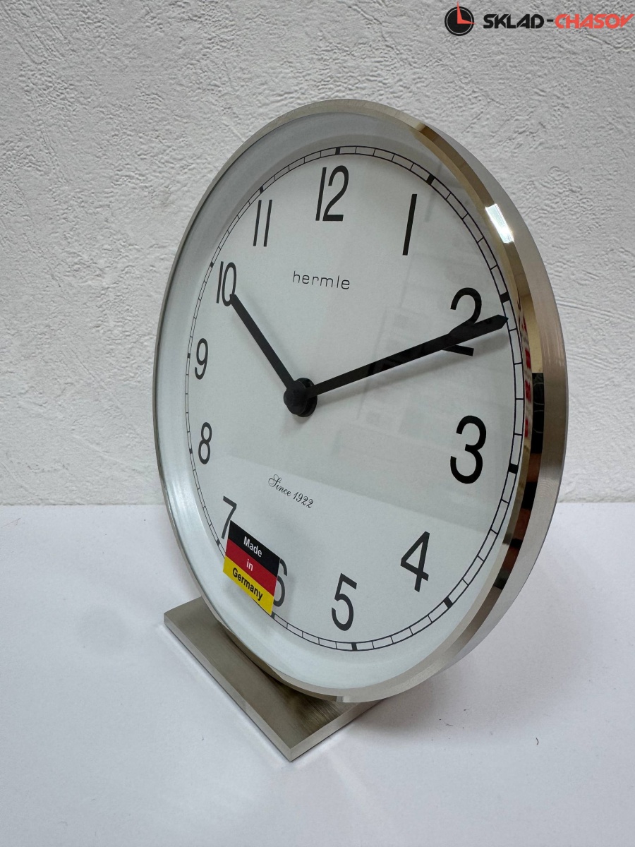 Часы на подставке выполнены в круглом корпусе из латуни, цвет: никель. Циферблат белого цвета с черными арабскими цифрами и черными стрелками. Бесшумный кварцевый механизм не требующий подзавода.