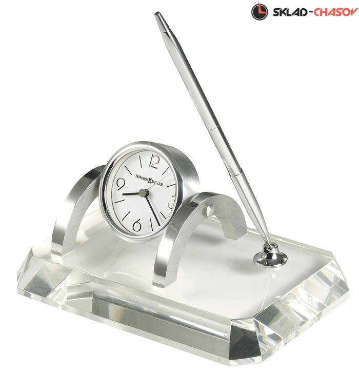 Howard Miller 645-724 PROMINENCE DESK SET. Корпус выполнен из оптического хрусталя, матового и полированного серебра. Классический круглый белый циферблат с серебристым ободом. Временные рамки обозначены большими арабскими цифрами и визирами (черточками). В комплектацию включена 1 батарейка. Типа LR44. Для заправки ручки подходят стержни AT Cross®. В задней панели часов помещена рамка для фотографий.