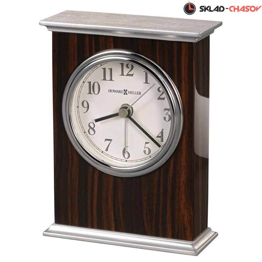 Настольные часы Howard Miller 645-747 Regal (Ригал). Часы-будильник в классическом английском стиле, отделаны в суперглянцевом цвете полированного Черного дерева Макассар (Macassar Ebony). Основание и верхняя накладная панель – из металла серебристого цвета. Белый циферблат с двухцветными цифрами обрамлен полированным рифленым ободком серебристого цвета. Кварцевый механизм с будильником, в поставку включена 1 батарейка типа АА.