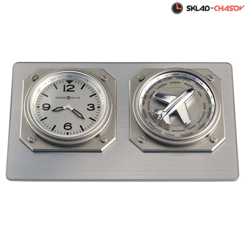 Кварцевые настольные часы Howard Miller 645-765 Aviatrix (Авиатрикс) не требущим подзавода.Часы с мировым временем .Наклонный корпус с брашированной алюминиевой поверхностью дополняют 2 циферблата с матовой серебристой поверхностью. Повернув полированный хромированный самолет на правом циферблате на один из городов мира, часовые стрелки на левом циферблате покажут время в выбранном городе.Левый циферблат имеет 24-часовой формат времени, защищен акриловым стеклом.Временные рамки обозначены арабскими цифрами.