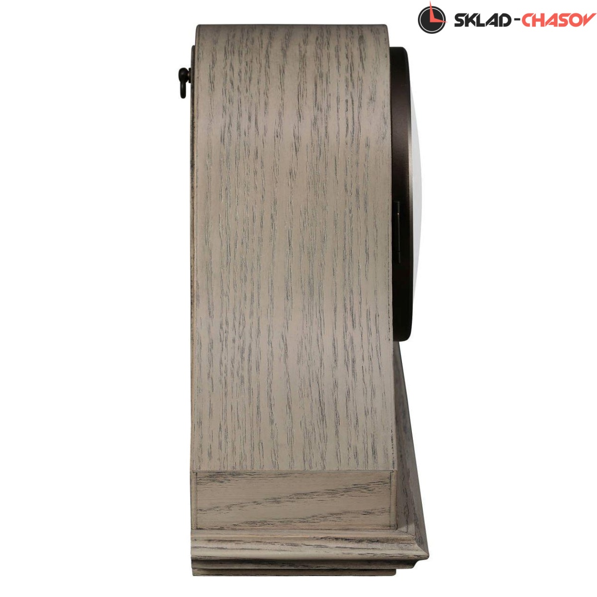 Корпус часов выполнен из отборных пород массива и шпона и отделан в цвете Seaside Gray. Белый циферблат закрыт сферическим стеклом и римскими цифрами угольно-серого цвета. Часовая и минутная стрелки также выполнены в угольно-сером цвете, что прекрасно гармонирует с циферблатом.