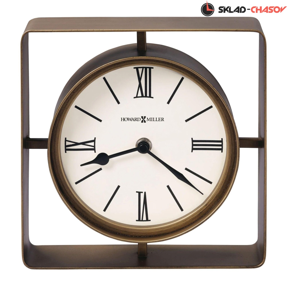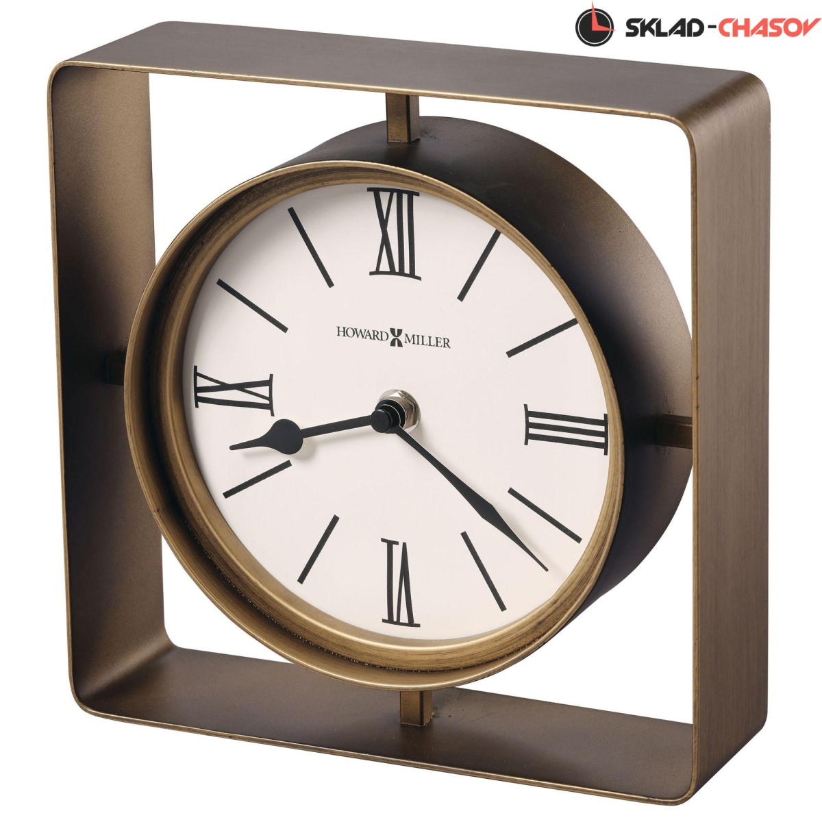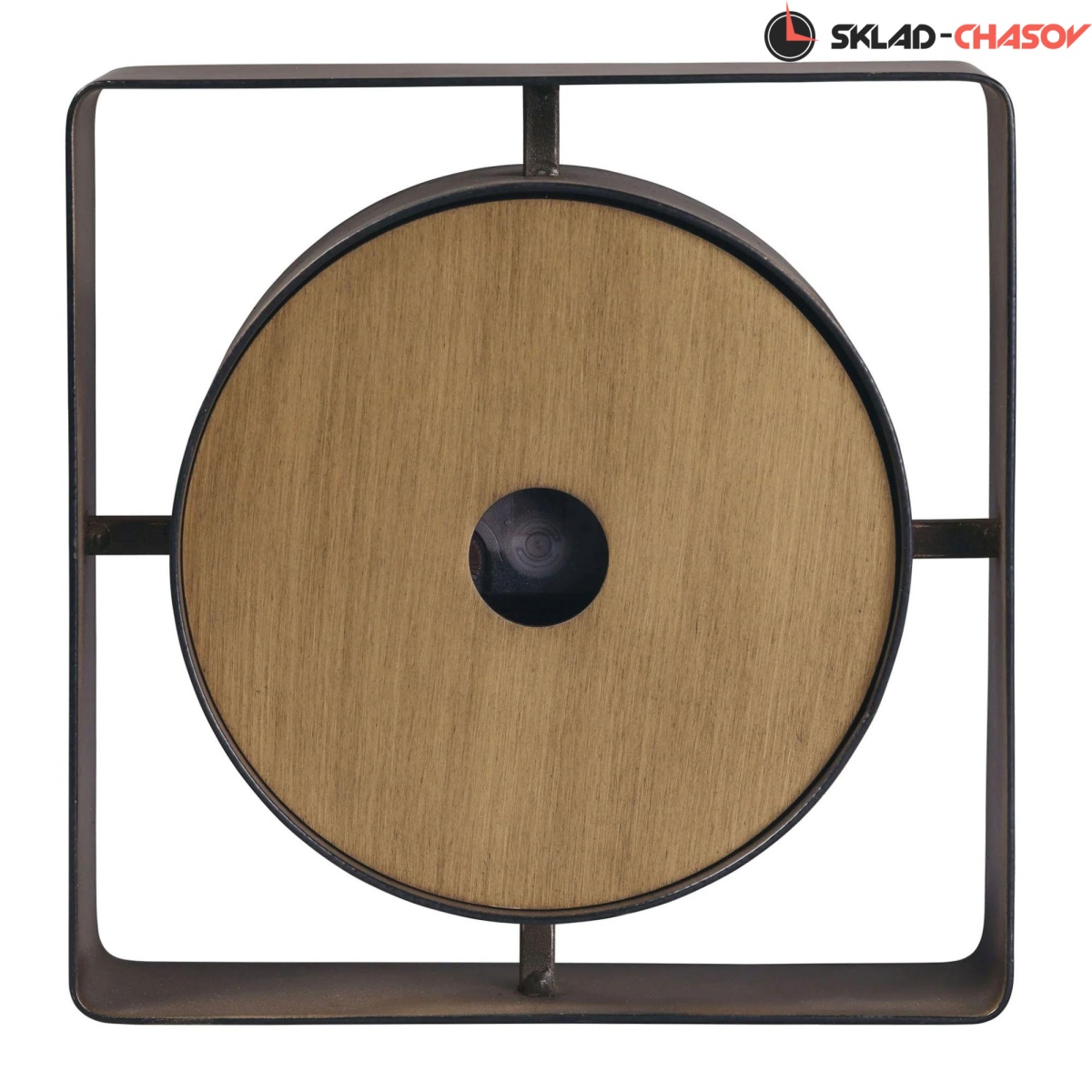 Круглое металлическое основание этих часов заключено в квадратную металлическую рамку.