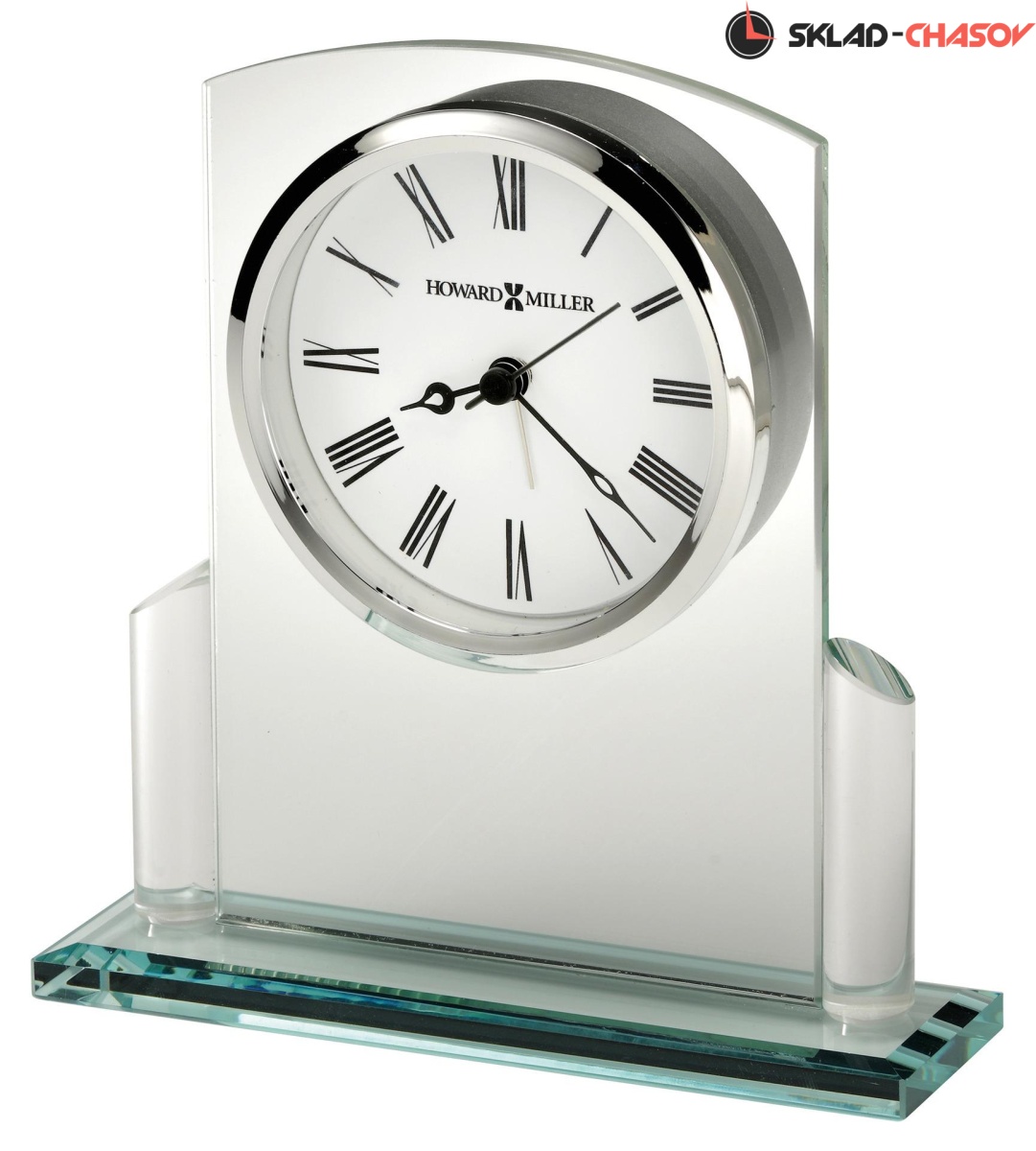 Стеклянные часы-будильник арочной формы на стеклянном основании со стеклянными стойками.