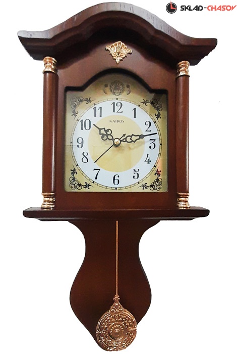 Кварцевые настенные часы с маятником Kairos KR002. Украшением часов является рифленый циферблат с декоративными расписными элементами. Фигурные стрелки тоже придают модели изысканность. Часы отлично впишутся в интерьер гостиной. Корпус из дерева (МДФ), украшен металлическими элементами. Ход стрелок — плавный (бесшумный).