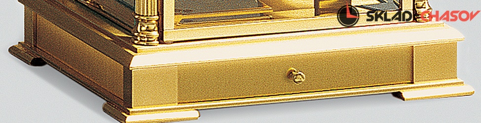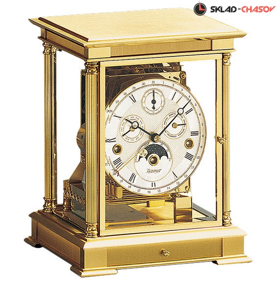 Механические настольные часы Kieninger 1240-06-05 c боем. Часы-"скелетон", выпущенные ограниченной серией - 250 экземпляров. Классический позолоченный латунный корпус, 4 колонны с декоративной отделкой, 2 двери с хрустальным ограненным стеклом.Посеребренный циферблат с индикацией даты, месяца, дня недели и фазы Луны украшен ромбовидной гравировкой. Небольшой ящик для ключей в основании корпуса. Звуковой сигнал: бой каждый час, 3 мелодии Westminster, St.Michael's, Whittington каждые четверть часа. 8-стержневой гонг. Механизм: механический (11 камней), калибр J0221. Автоматическое отключение боя c 22.00 до 7.15 ч. (патент Kieninger). Посеребренный циферблат с римскими цифрами. Дата отображается центральной стрелкой. Регулятор - спусковой механизм (11 камней).