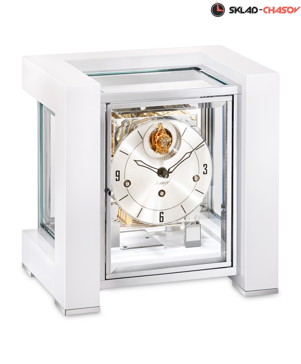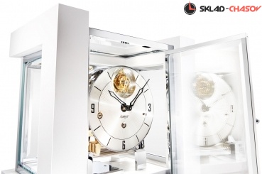 Механические настольные часы Kieninger 1266-95-04 с боем. Модель оснащена функцией боя.3 мелодии Westminster, St. Michael, Whittington.8-ми стержневой гонг.Автоматическое ночное отключение мелодии и боя с 22:00 до 07:15 (патент Kieninger). Корпус этих великолепных часов изготовлен из массива дерева с белой глянцевой фортепианной отделкой, со вставками из хромированной полированной бронзы.Классический круглый циферблат, открытый механизм. Временные рамки обозначены большими арабскими цифрами и визирами.