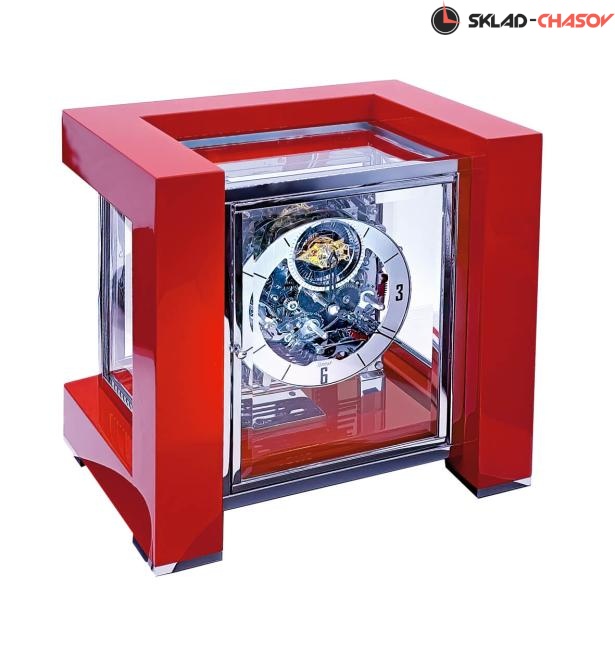 Дизайн часов выполнен в виде куба с использованием дерева, стекла и латуни. Объемная конструкция из массива дерева с красной глянцевой поверхностью "под рояль" на 4 хромированных ножках. Стеклянные элементы обеспечивают беспрепятственный обзор механизма, каждый из них имеет сложную хромированную конструкцию и содержит в общей сложности 5 граненых хрустальных бокалов и 2 дверцы. Необычный дизайн дополняют посеребренное латунное кольцо с циферблатом, секундным индикатором и изящными стрелками Breguet. Особенность этих часов: