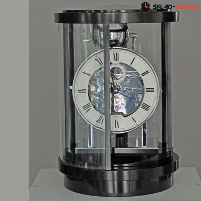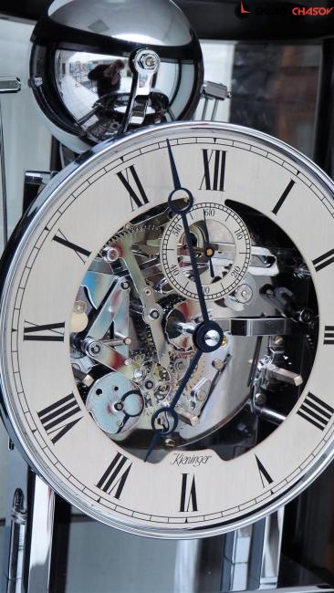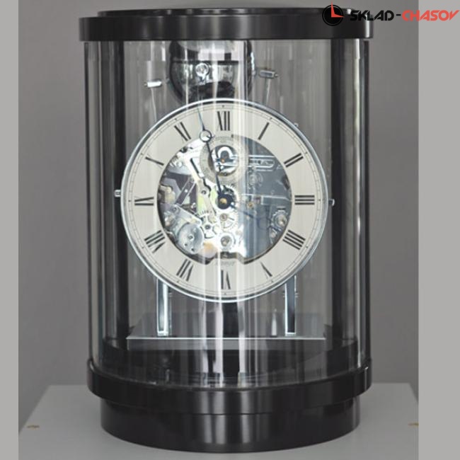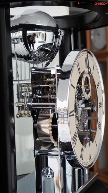 Типичные каминные часы, покрытые черным полированным лаком, имеют полностью круглую форму. Изогнутые и граненые стекла, арочный стеклянный верх и открытое посеребренное кольцо с циферблатом длиной 18 см и секундной стрелкой позволяют полностью рассмотреть часовой механизм и ход курантов. Переднее стекло можно открыть, повернув его назад.