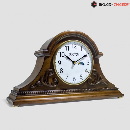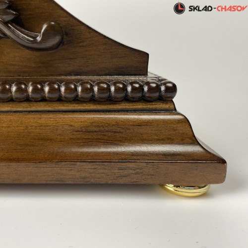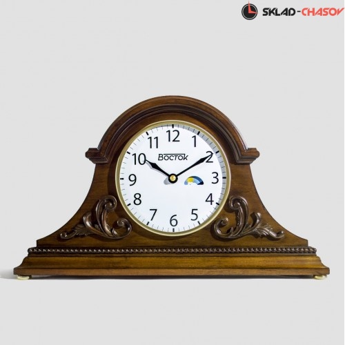 Каминные, настольные часы в деревянном корпусе «Восток» – изящный и роскошный предмет интерьера. Настольным часам во все времена отводилась особая роль. Любое помещение, будь то гостиная загородного дома или квартиры, мгновенно преобразятся. Каминные часы «Восток» создадут уют и подчеркнут вашу преданность традициям. - циферблат - белый, арабские цифры, с функцией день-ночь; - корпус массив черной ольхи; - габариты – 450х260х117 мм; - механизм 5-ЧМ; - часовой механизм на 13 рубиновых камнях с анкерным ходом; - ход механизма за 6 суток после завода заводной пружины в пределах ±90 секунд при температуре 20±5 ºС, относительной влажности 80% за сутки; - суточный ход механизма в нерабочем положении (циферблатом вверх) должен быть в пределах ±90с при температуре (20±5)°С, относительной влажности 80% за сутки; - продолжительность работы от полной заводки заводной пружины не менее 8 суток; - температурная погрешность механизма не более 1 секунды на 1 ºС за сутки в пределах рабочих температур от +50 ºС до -25 ºС. Техническое обслуживание: Заводить часы следует один раз в 7 дней. Установка на точное время производится последовательным переводом минутной стрелки в направлении движения часовой стрелки. При переводе стрелок в целях сохранения работоспособности часов, не допускается касание секундной стрелки. Регулировка точности хода часов производится путем передвижения поводка, находящегося в верхней части циферблата.