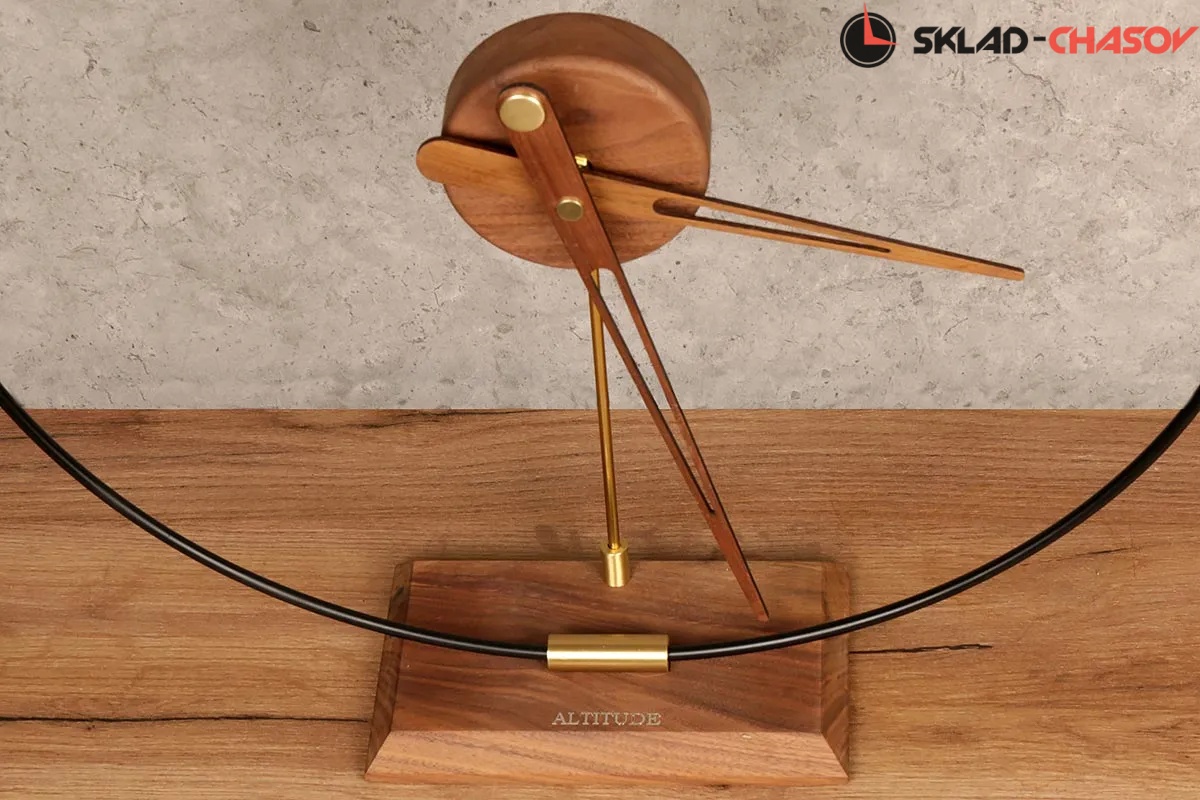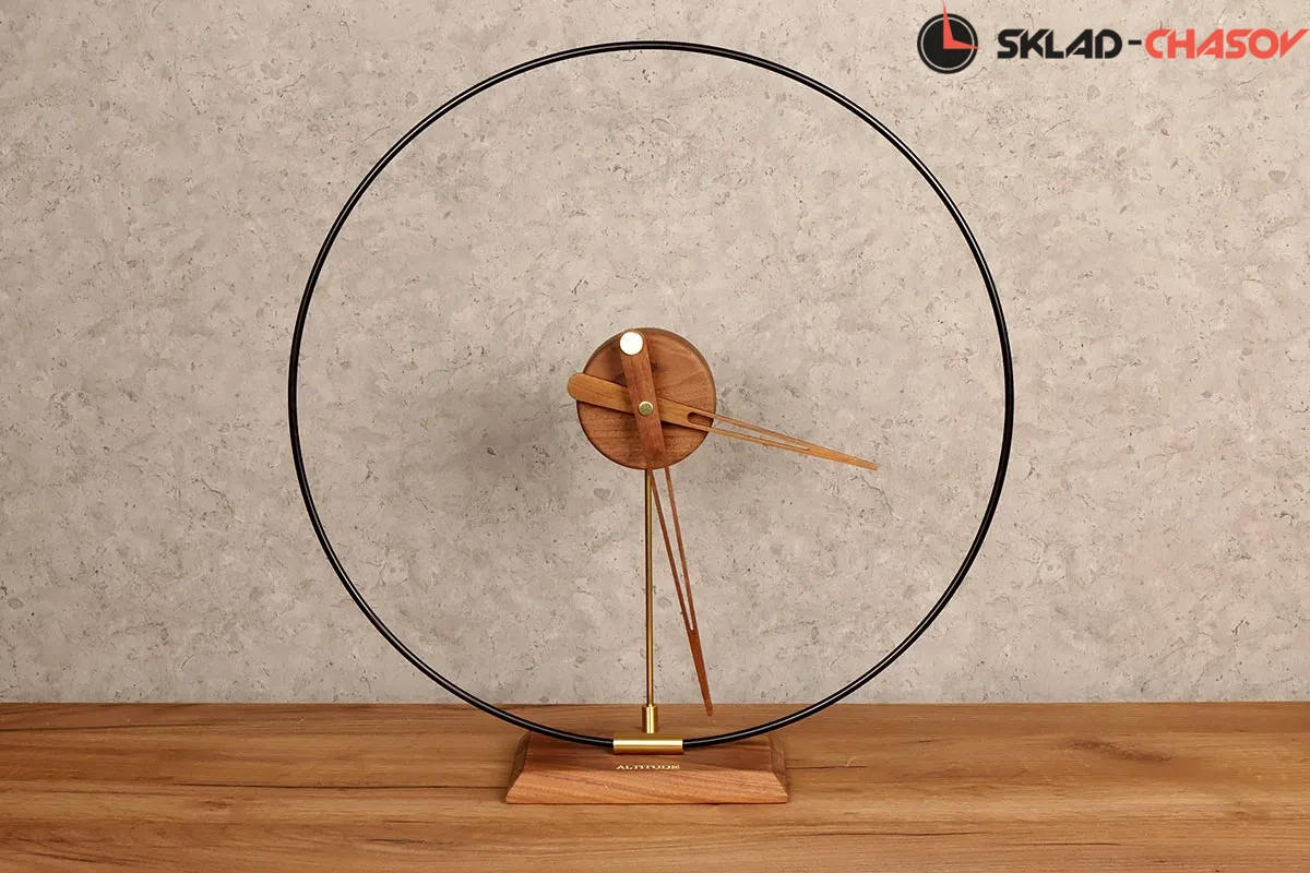Настольные интерьерные часы от немецкого дизайнера Фридриха Кельна. Необычный дизайн украсит пространство стильного загородного дома или современной роскошной квартиры. «Метеор парящий в сфере» - вот идея создания. Изготовлено из шлифованного чёрного металла и натурального дерева, подставочка деревянная. Часы с кварцевым механизмом.