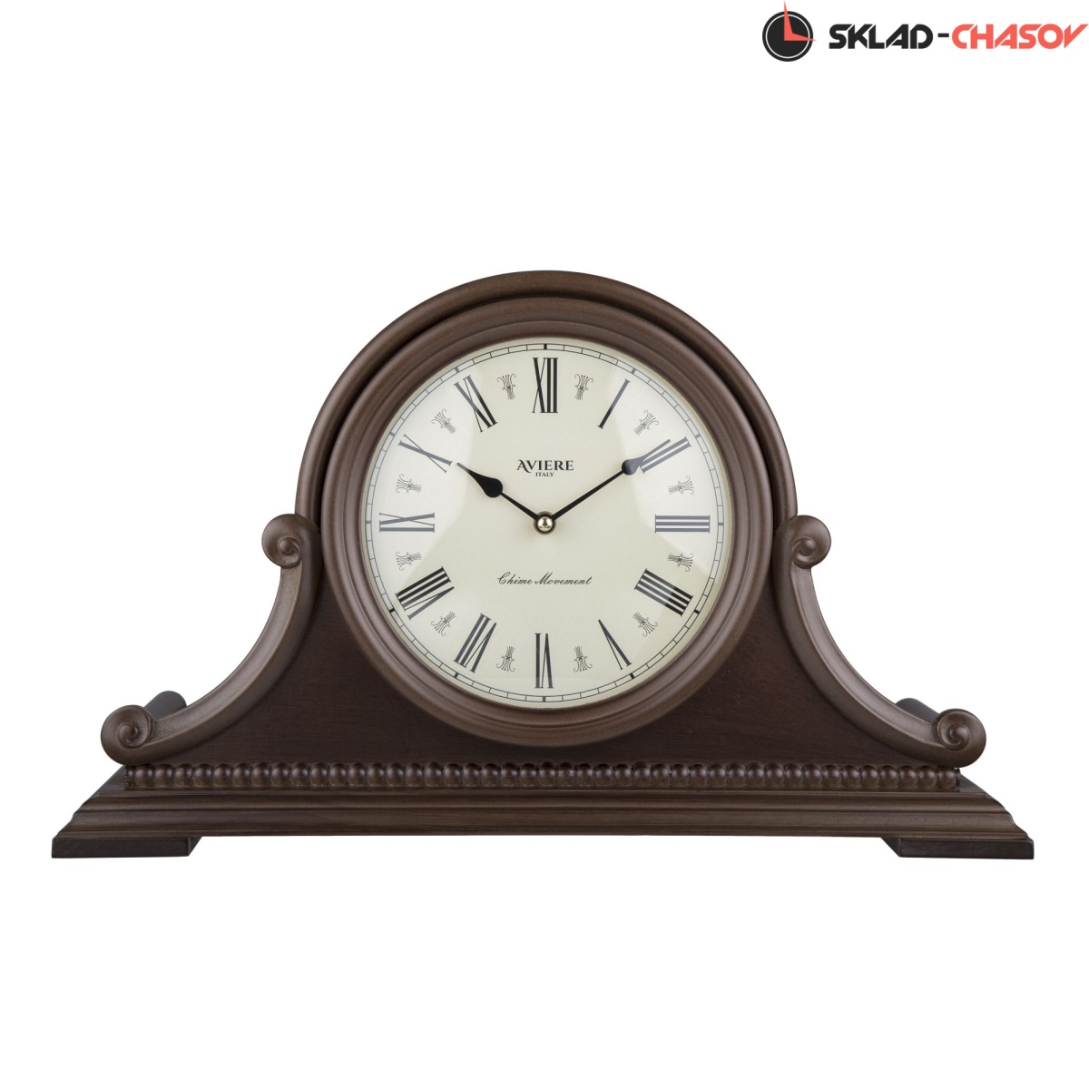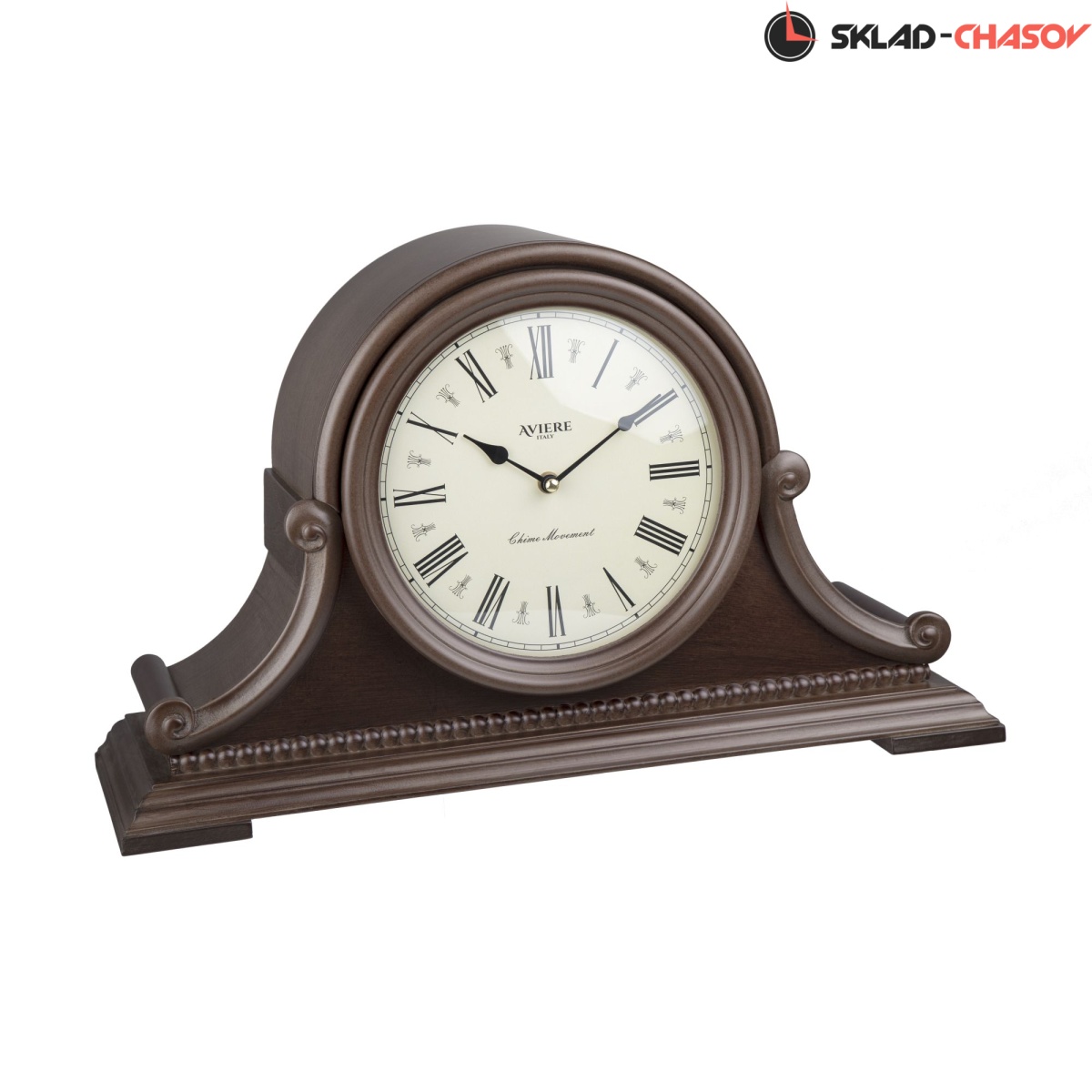 Резной молдинг в форме бус опоясывает основание часов.