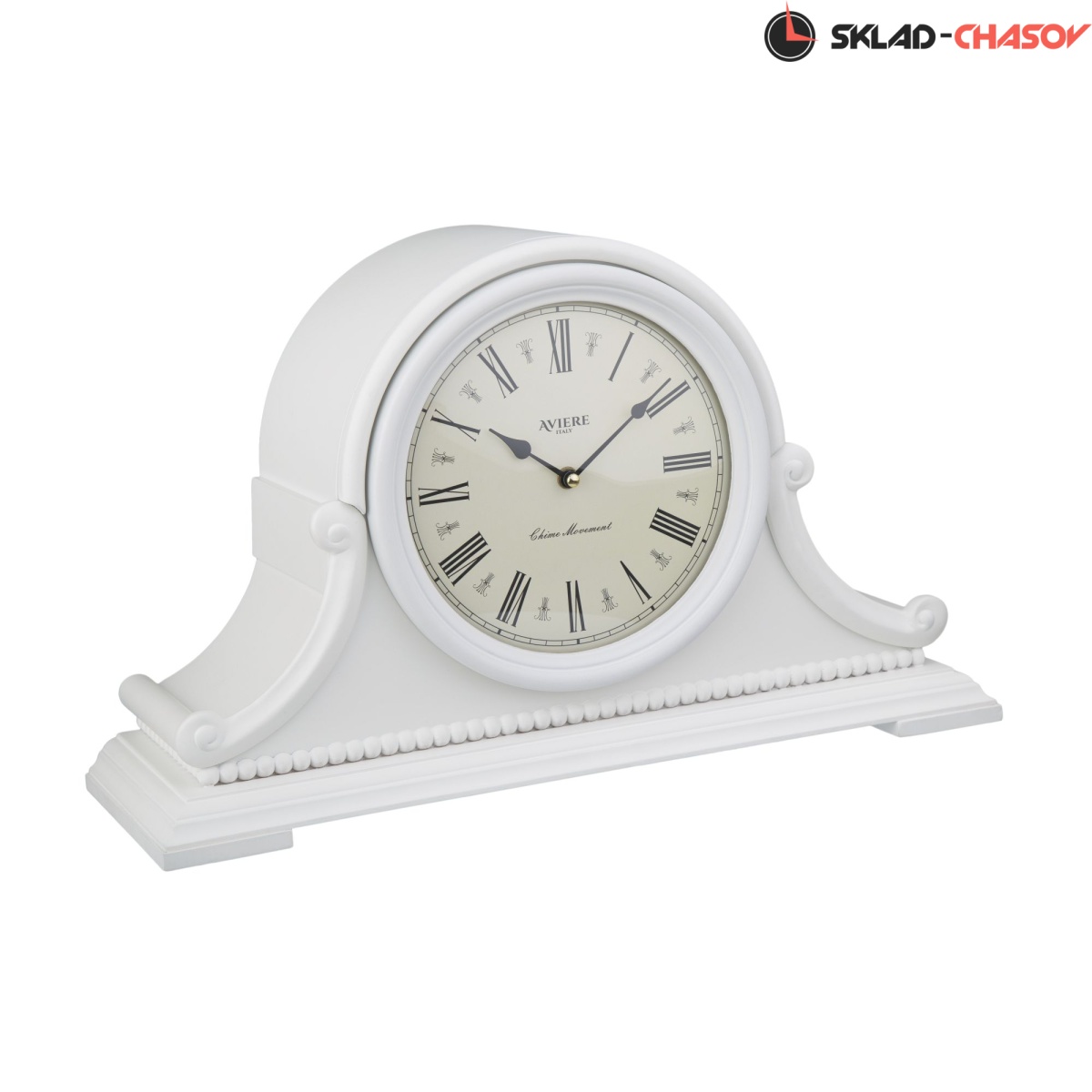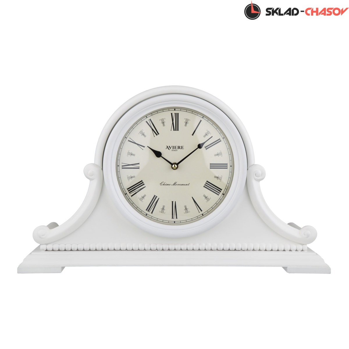 Резной молдинг в форме бус опоясывает основание часов.