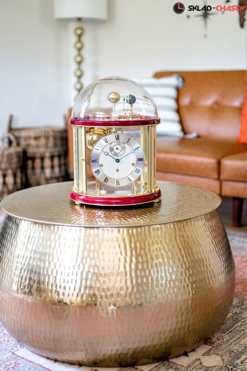 Земля проходит через 12 знаков Зодиака, месяцы и дни, которые можно прочитать на плоском циферблате. 8-дневный Вестминстерский ударный механизм 4/4 на четырех полированных колокольчиках.
