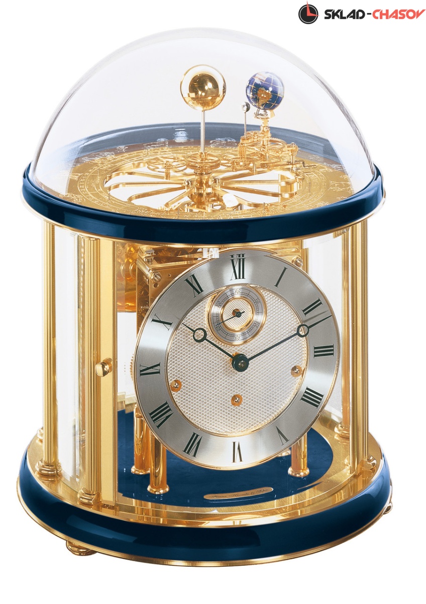 Земля проходит через 12 знаков Зодиака, месяцы и дни, которые можно прочитать на плоском циферблате. 8-дневный Вестминстерский ударный механизм 4/4 на четырех полированных колокольчиках.