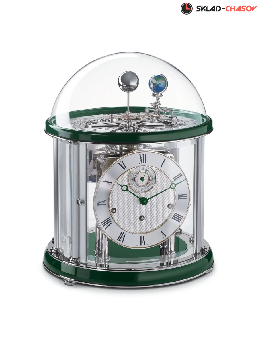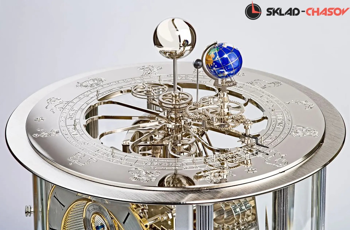 Теллур показывает оборот Земли вокруг Солнца один раз в год, при этом Земля совершает оборот вокруг самой себя каждые 24 часа. В то же время Луна обращается вокруг Земли один раз в 29 с половиной дней, поворачиваясь один раз вокруг своей оси, так что с земли можно наблюдать отдельные фазы Луны. Земля проходит через 12 знаков Зодиака, месяцы и дни, которые можно прочитать на плоском циферблате.