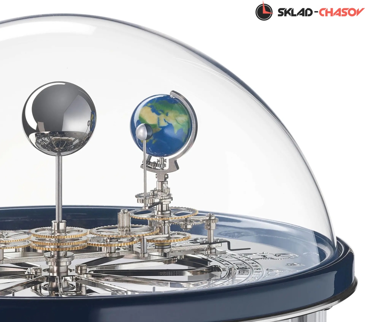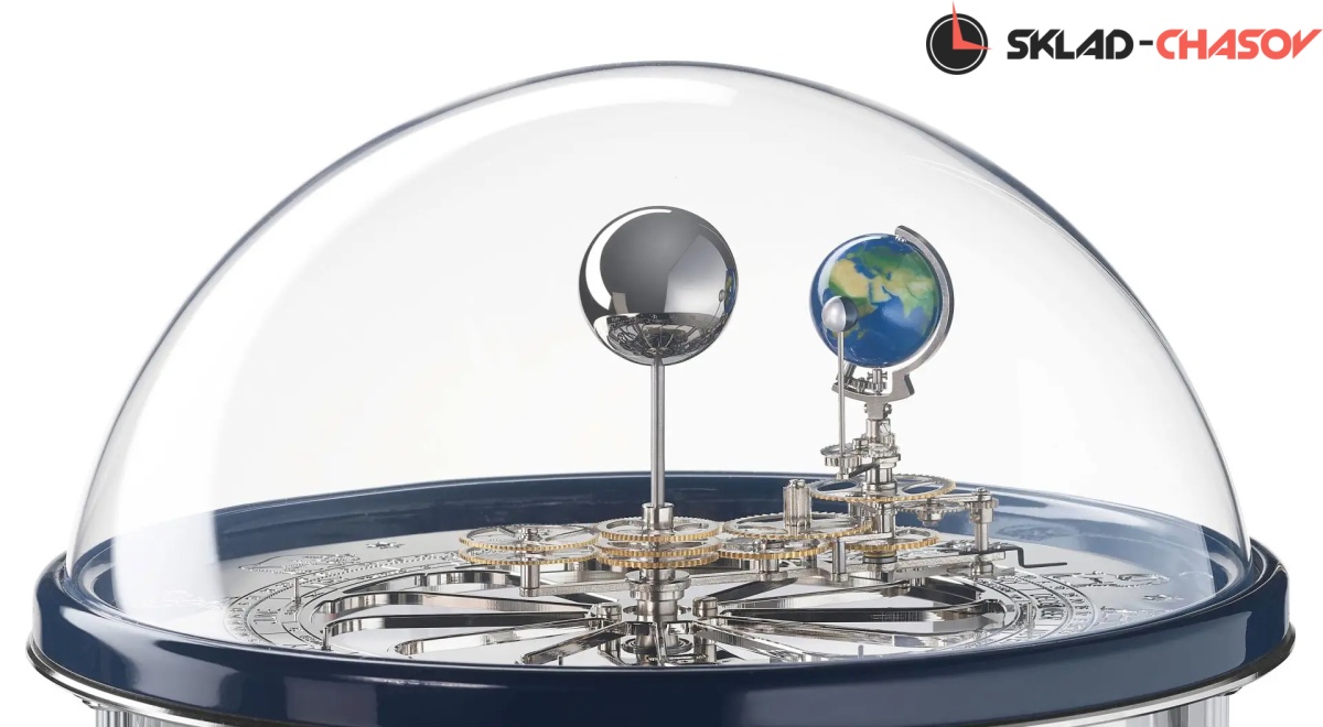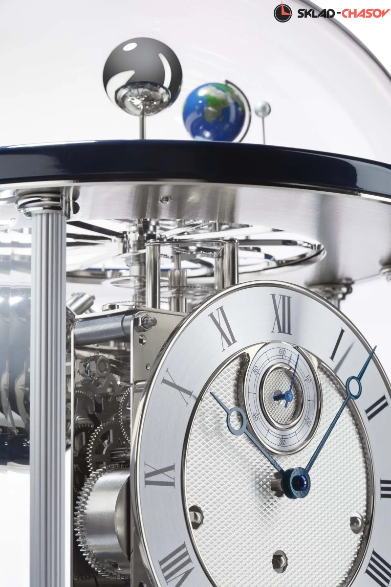 Теллур показывает оборот Земли вокруг Солнца один раз в год, при этом Земля совершает оборот вокруг самой себя каждые 24 часа. В то же время Луна обращается вокруг Земли один раз в 29 с половиной дней, поворачиваясь один раз вокруг своей оси, так что с земли можно наблюдать отдельные фазы Луны. Земля проходит через 12 знаков Зодиака, месяцы и дни, которые можно прочитать на плоском циферблате.