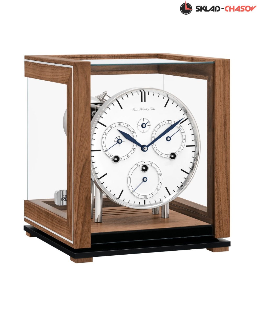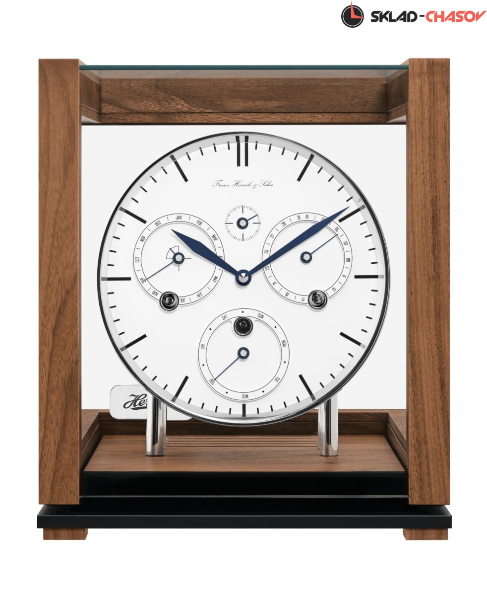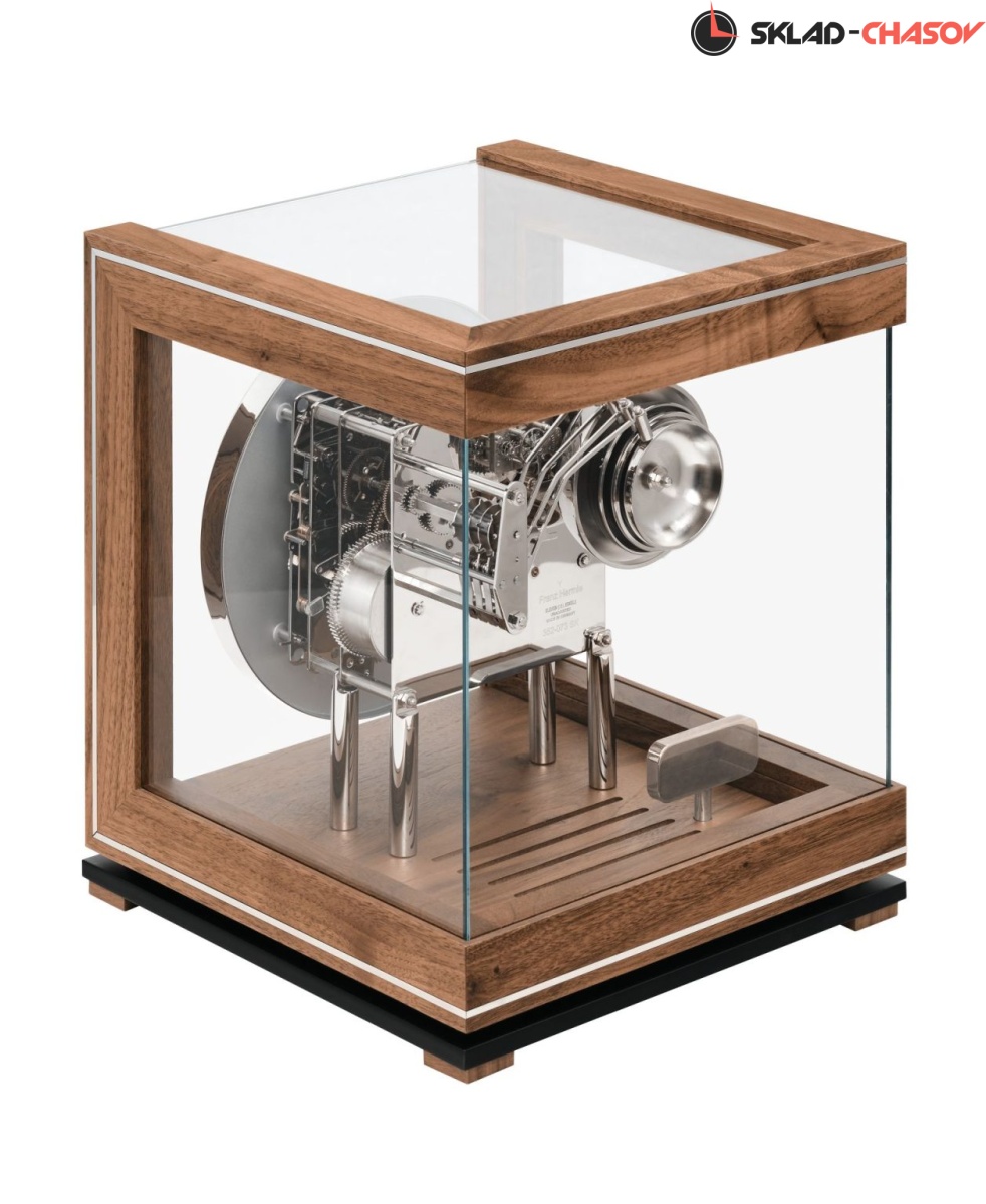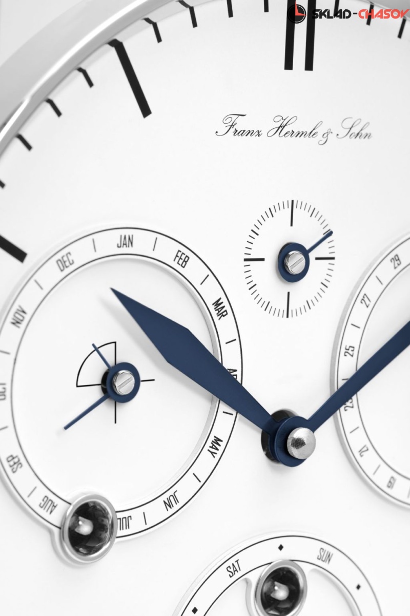 Новый вечный календарь оснащен отполированным до блеска вестминстерским механизмом W0352, который необходимо заводить каждые восемь дней. Этот Вестминстерский ударный механизм отбивает каждые 15 минут, количество часов указано в часах, и при необходимости может быть отключен на ночь благодаря автоматическому ночному отключению (последний удар в 21:45, следующий в 7:00). Ненавязчивый звук колокольчиков создаст в вашем доме приятную атмосферу уюта. Новая заводная клавиша вечного календаря покрыта хромированным лаком и искусно утоплена за механическим механизмом. Механизм хорошо виден со всех сторон благодаря антибликовому стеклу на передней панели. Еще одной изюминкой этих часов является куб, который необходимо снять с верхней части, чтобы завести механизм. Стрелки на белом циферблате окрашены в синий цвет вручную.