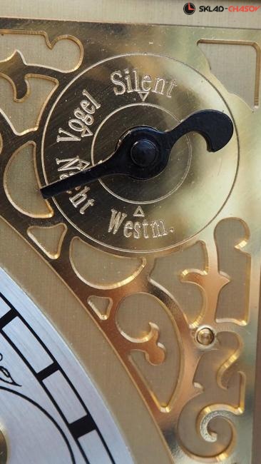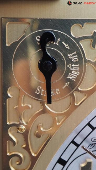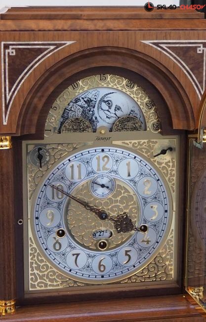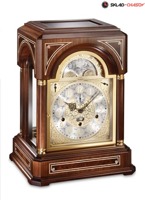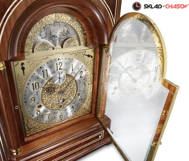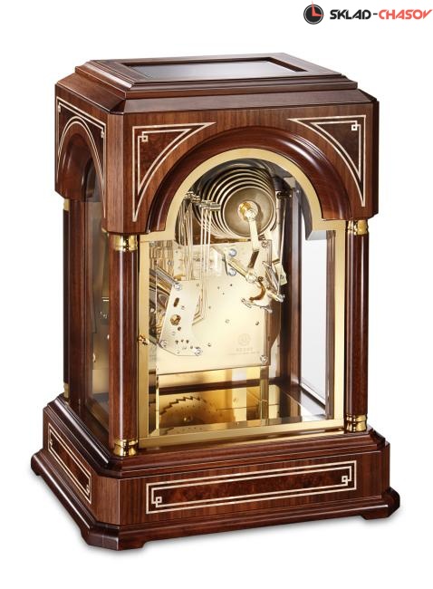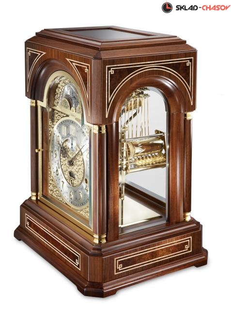 Настоящая жемчужина немецкого часового искусства. Эти настольные часы представляют собой идеальное сочетание высокого мастерства столяра и уникального механизма Моцарта с боем в 9 склянок. Корпус изготовлен из темного ореха с инкрустацией из перламутра. Сердцем часов является недавно разработанный колокольчик с всемирно известными мелодиями из серенады соль мажор "Eine Kleine Nachtmusik" (К. 525, дата создания 1787) и арией Папагено "Птицелов я такой" из оперы "Волшебная флейта" (К. 620, премьера состоялась в Вене в 1791 году). Искусно выполненный корпус из орехового дерева со скошенным хрусталем в дверце, боковых панелях и крыше позволяет отчетливо видеть изящные куранты. Изысканный гравированный лунный циферблат со знаменитым видом города Моцарта Зальцбурга на лунном диске, радиальный переключатель хода, индикация даты и секунд дополняют элегантный дизайн механизма REC03: подпружиненный на 1/4 часовой механизм со спусковым механизмом (11 камней), 3 мелодии (Вестминстер, Фогельсангер, kleine Nachtmusik) на корпусе. бьют 9 колоколов.