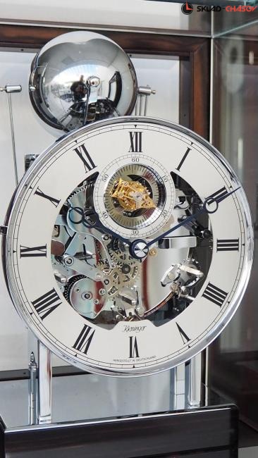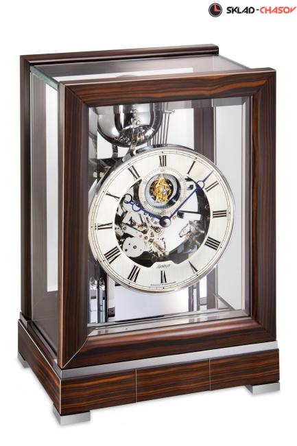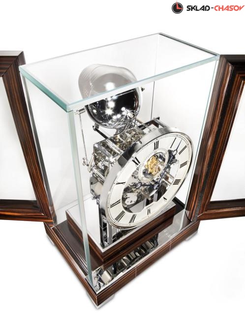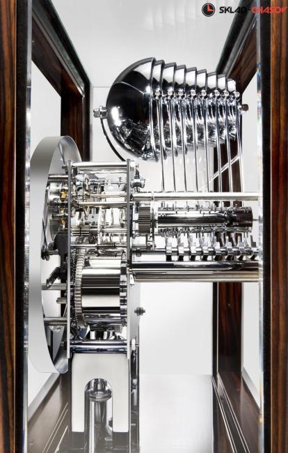 Современные каминные часы с турбийоном: Прозрачный корпус из элегантного черного дерева со свободно распашными дверцами и ящичком для ключей в основании. Стеклянная конструкция без рамы позволяет беспрепятственно наблюдать за часовым механизмом с девятью бриллиантовыми колокольчиками, хромированным механизмом и аксессуарами. Здесь вы можете увидеть турбийон в действии.