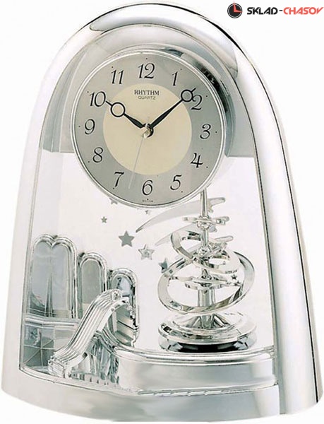 Настольные часы с маятником. Цвет - серебряный. Материал - пластик. Элемент питания - ААх2 (входит в комплект).