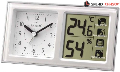 Японский кварцевый будильник с бесшумным плавным ходом секундной стрелки.Тип сигнала - импульсный, ("пик-пик-пик"). Нарастающие темп и громкость сигнала(4 уровня).Отложенный подъем: повтор сигнала через 5 минут.Термометр и гигрометр.Диапазон измерения: температуры от -9,9 градусов до +50 градусов, влажности от 20% до 95%.Функция записи максимальной и минимальной температуры и влажности за последние 24 часа.Автоиндикатор опасности: гипертермия, отравление пищей, грипп, плесень и пылевые клещи.Материал - пластикЭлемент питания - тип "АА" х 2 шт.(входит в комплект)