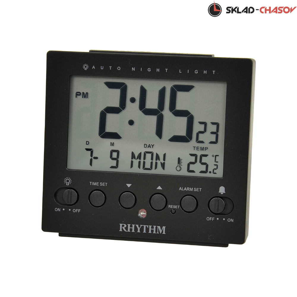 Новинка 2021г. Часы-будильник настольные. 4 шага усиления сигнала будильника. Повтор сигнала. Светодиодная подсветка зеленого цвета, датчик для автоматического включения подсветки в темноте. Календарь. Термометр. 12/24- часовое отображение времени. Дни недели на 8 языках. Размер 10,0 х 9,0 х 4,3см. Вес 120гр. Цвет - черный. Материал - пластик. Элемент питания - ААх2 (входит в комплект)